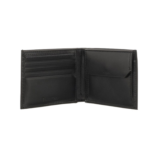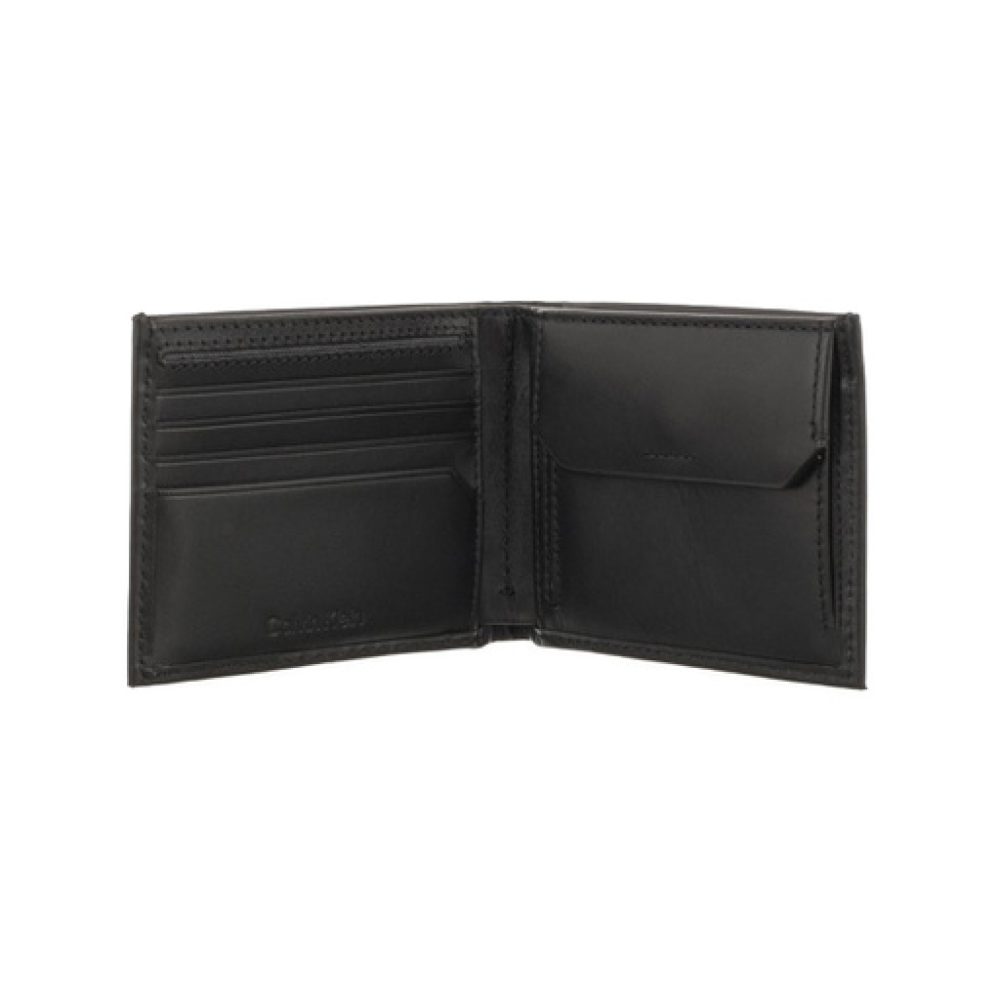 Carteira com 2 compartimentos; Porta-moedas; Espaços para cartões; Bloqueio RFID; Logótipo