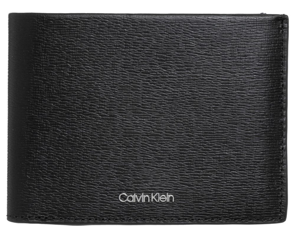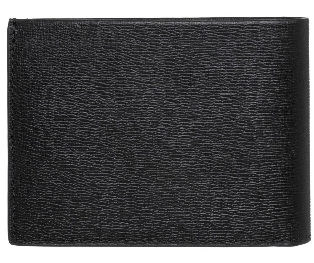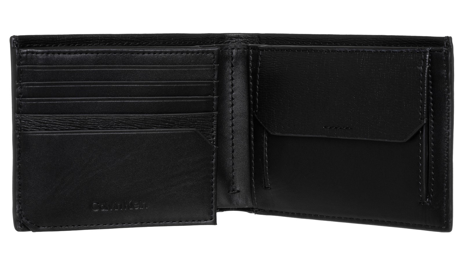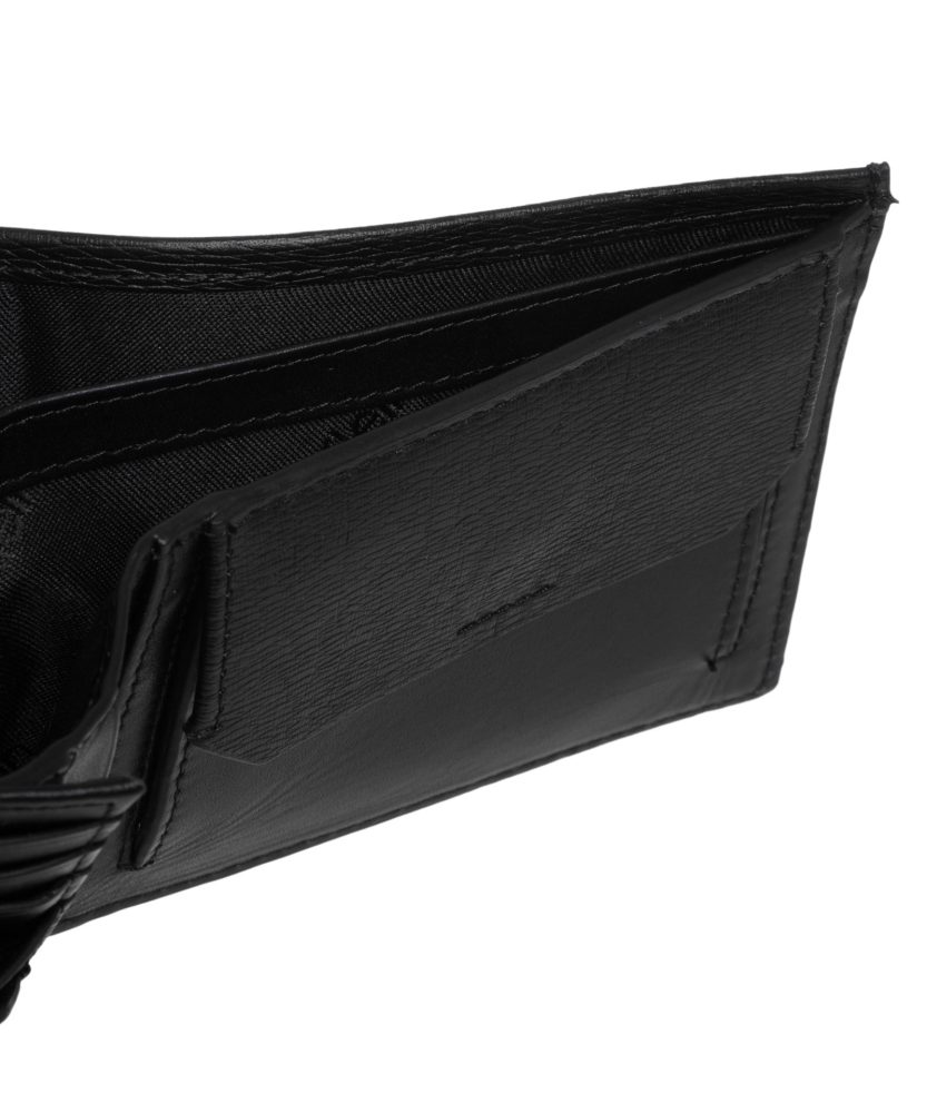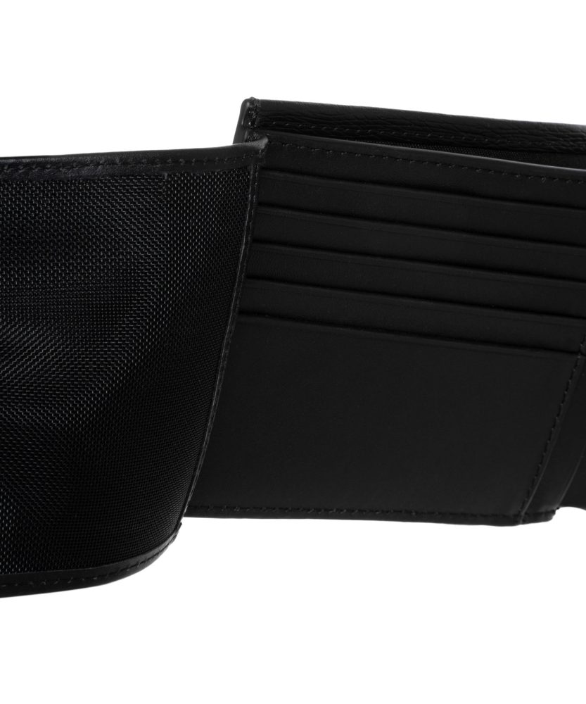 Carteira com 2 compartimentos, porta-moedas, espaços para cartões, bloqueio RFID e logótipo.