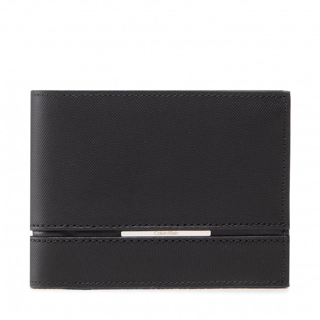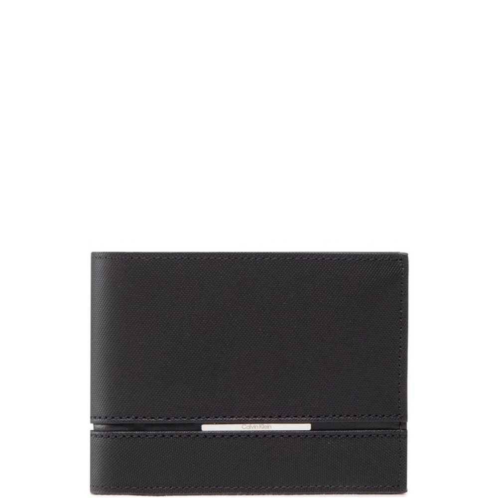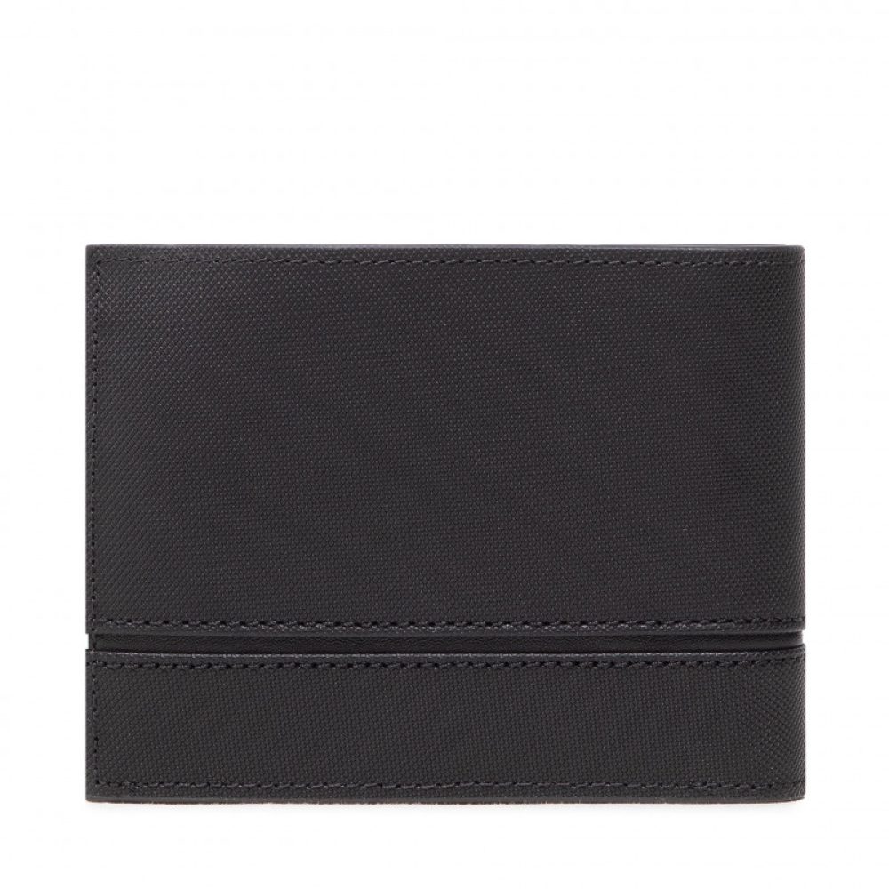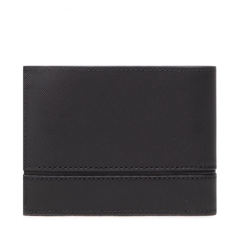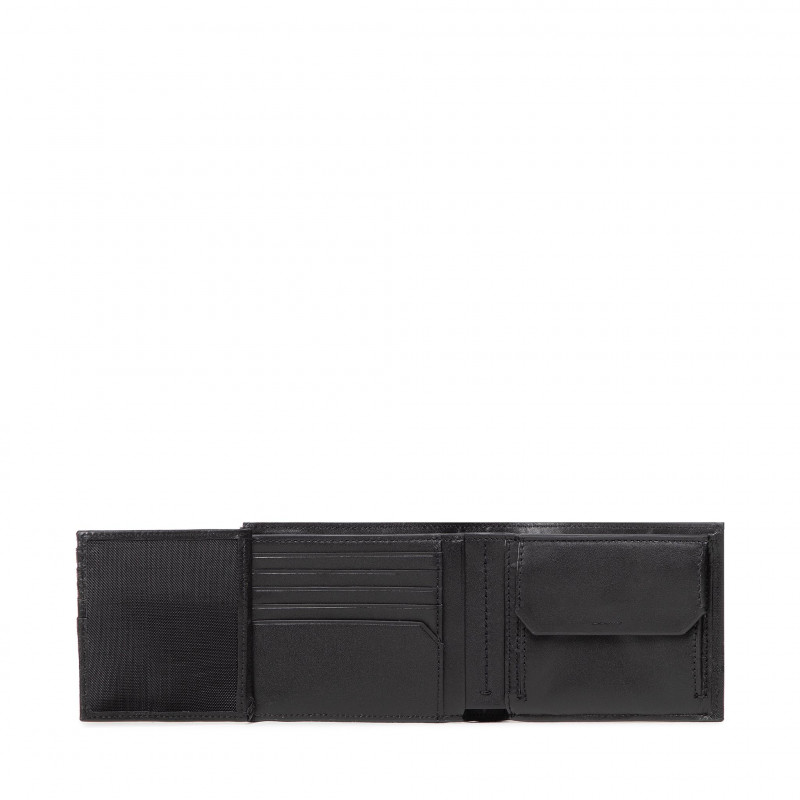 Carteira com 2 compartimentos, porta-moedas, espaços para cartões, bloqueio RFID, detalhes contrastantes e logótipo.