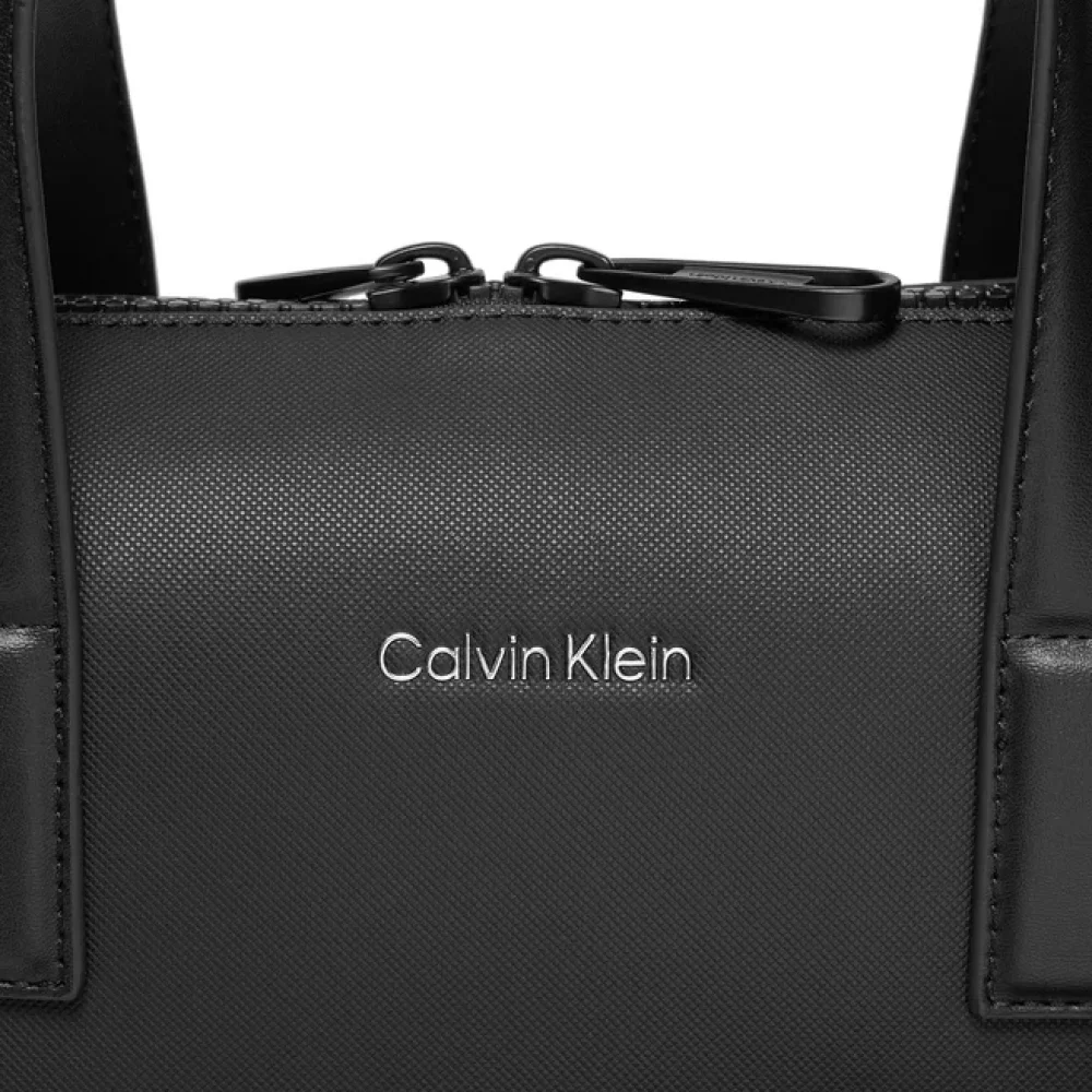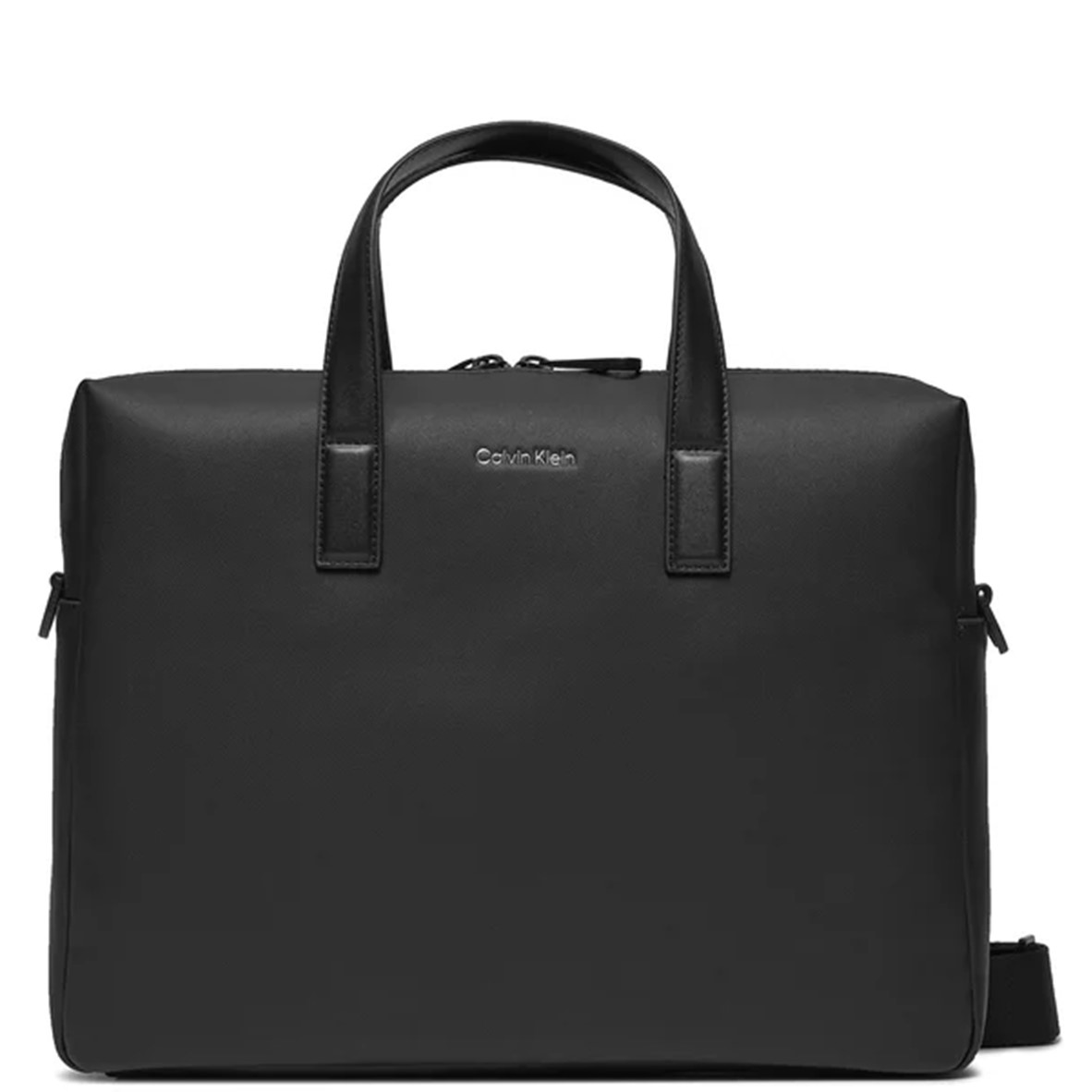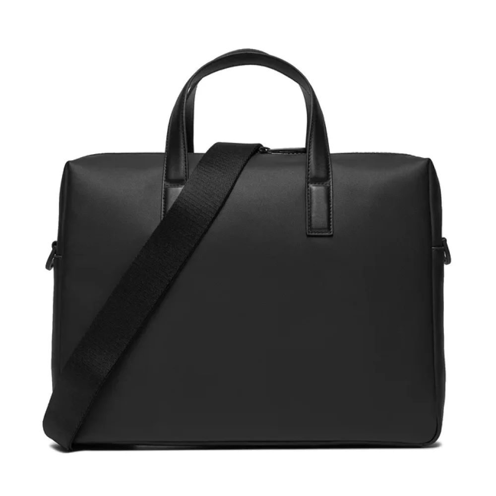 Mala de computador com 2 alças de mão; Fecho; Alça de ombro ajustável e removível; 1 bolso interno; 1 compartimento para portátil; Espaços para canetas; Detalhes contrastantes; Logótipo