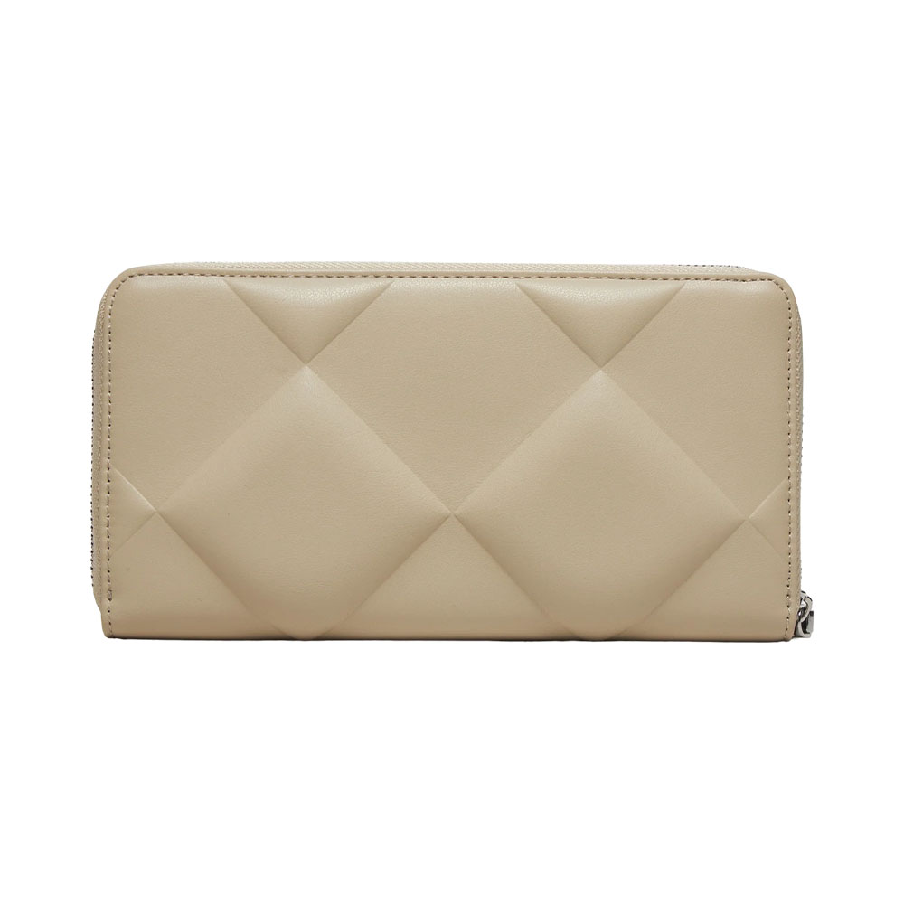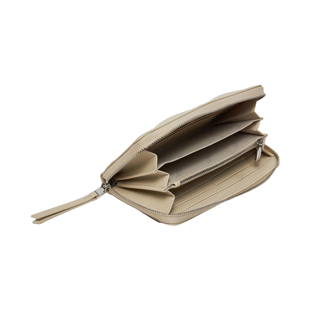 Carteira com 5 compartimentos, porta moedas, espaços para cartões, bloqueio RFID, fecho, detalhes contrastantes e logótipo.
