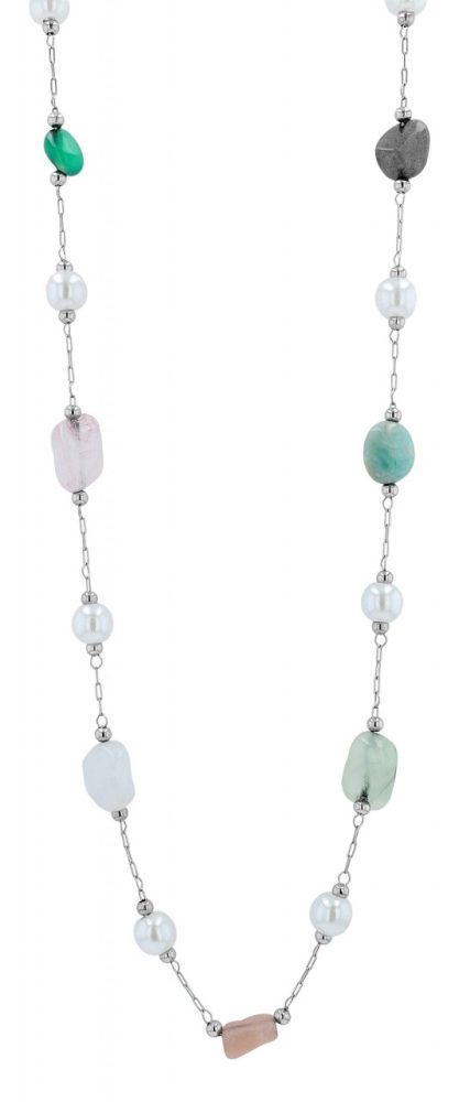 Colar em aço inoxidável “Candan” com pérolas de água doce e pedras coloridas. Dimensões: 41 cm + 5,5 cm de extensão.