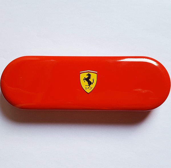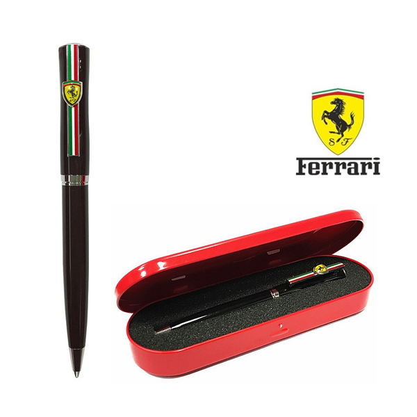 Caneta em metal preto com logo Ferrari Scudetto no topo e a bandeira italiana.