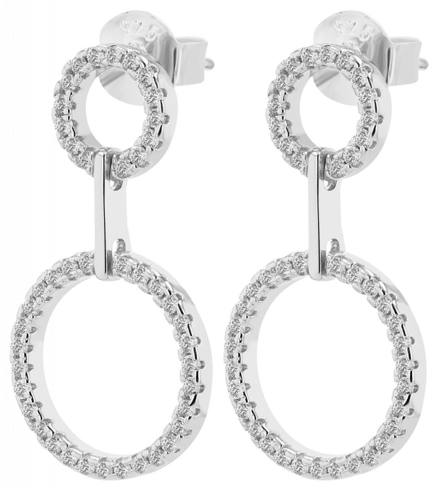 Os brincos “Caroline” caracterizam-se por dois círculos abertos, ligados entre si e que oscilam num movimento harmonioso. O círculo superior, diretamente no pino da orelha, tem um diâmetro de 7 mm e é habilmente engastado com 15 zircónias brilhantes. O círculo inferior, mais largo, mede 1,2 cm e brilha com 29 zircónias, o que lhe confere um brilho de cortar a respiração. Ambos os círculos estão ligados por uma fina barra de 7 x 1 mm, que confere uma elegância adicional. Os elementos móveis destes brincos não só criam um visual dinâmico, como também os tornam confortáveis de usar. Graças ao prático fecho de clipe, os brincos são fáceis de colocar e remover. Disponível em duas versões – dourada ou prateada com banho de ródio.