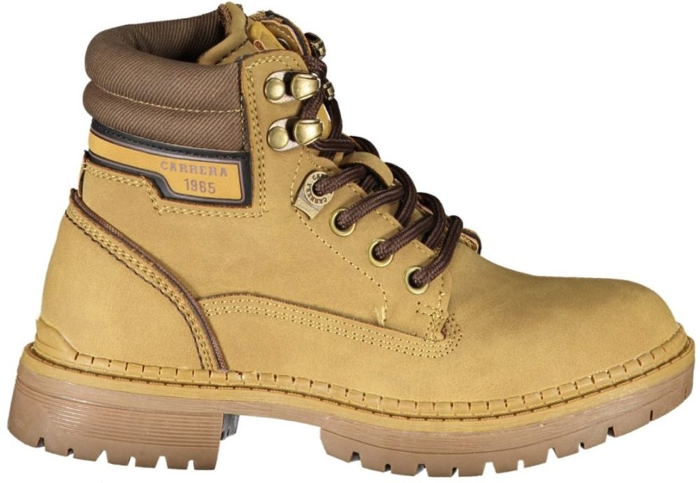 Bota com atacadores e fecho zíper lateral, detalhes de contraste, logótipo.