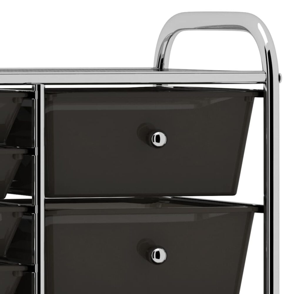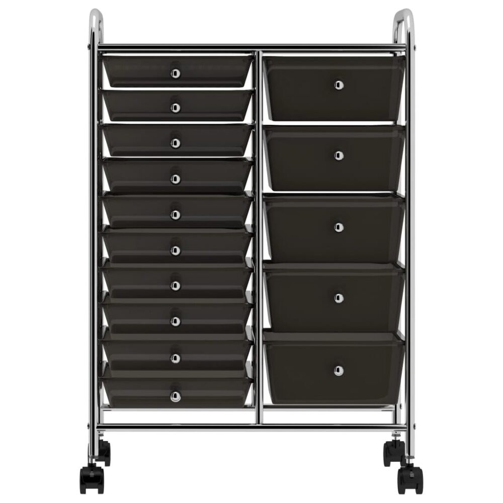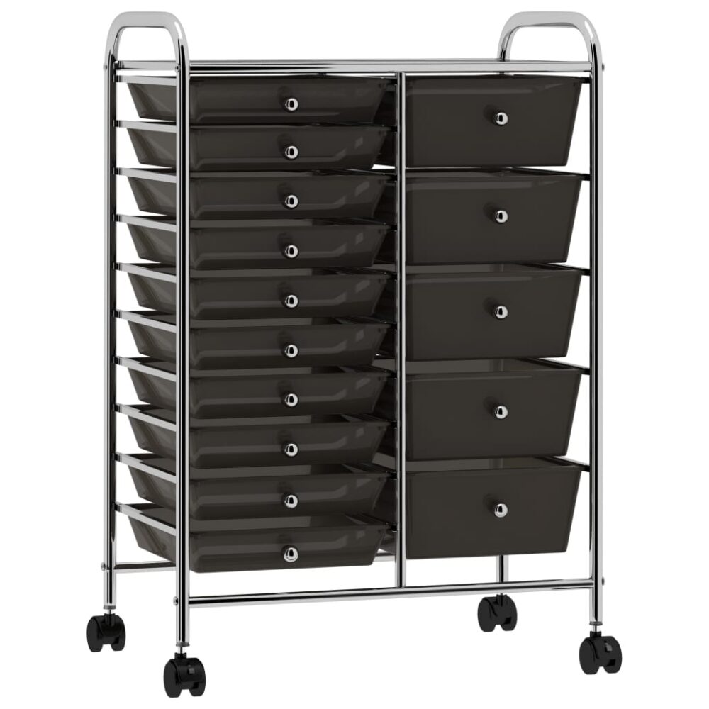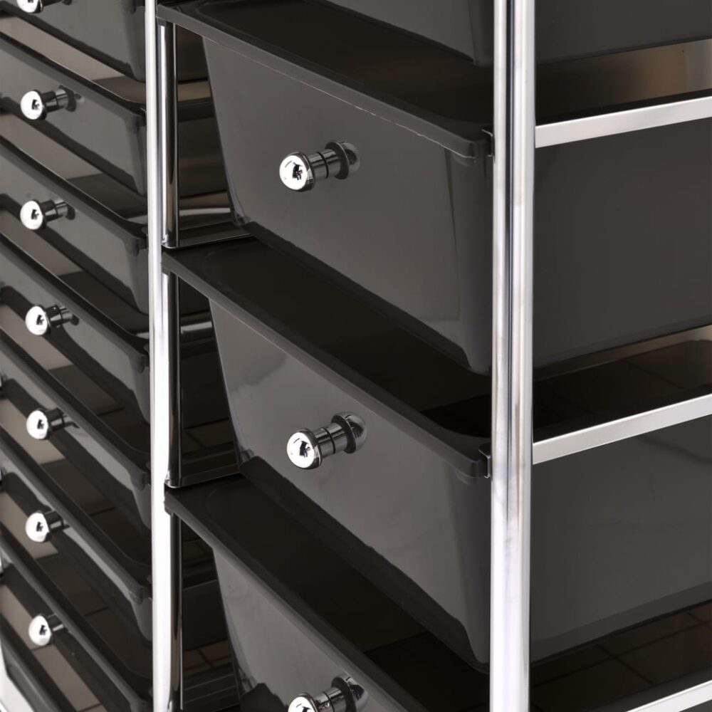 Este carrinho com gavetas possui um estilo conciso e prático, destinando-se a proporcionar-lhe um amplo espaço para manter o seu escritório e acessórios de beleza organizados e ao seu alcance. A estrutura cromada fornece um suporte de peso resistente e durável e os 15 cestos removíveis possuem espaço suficiente para colocar os seus itens. São fáceis de remover e limpar. As 4 rodas giratórias integradas facilitam ainda o transporte e a arrumação. Este carrinho de arrumação pode ser montado em pouco tempo.