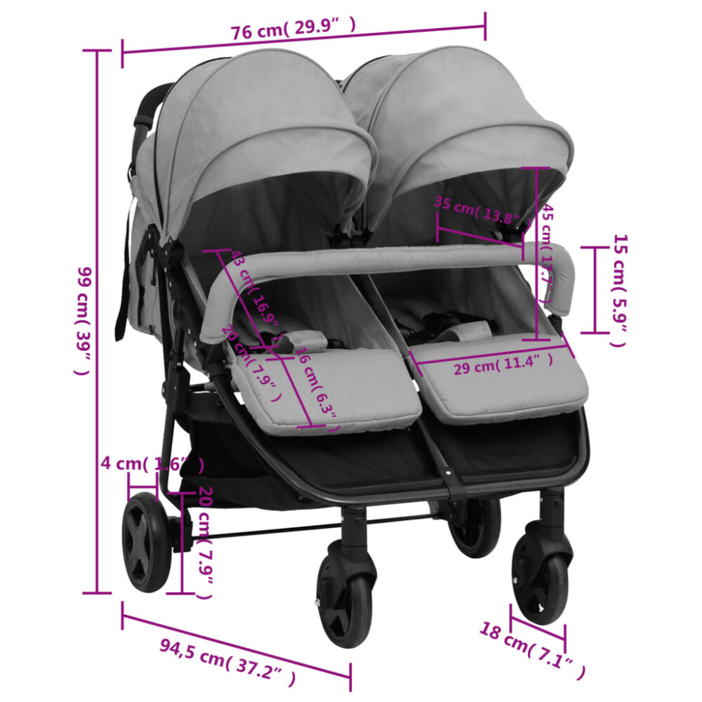 Carrinho de bebé para gémeos aço cinzento-claro e preto - PORTES GRÁTIS