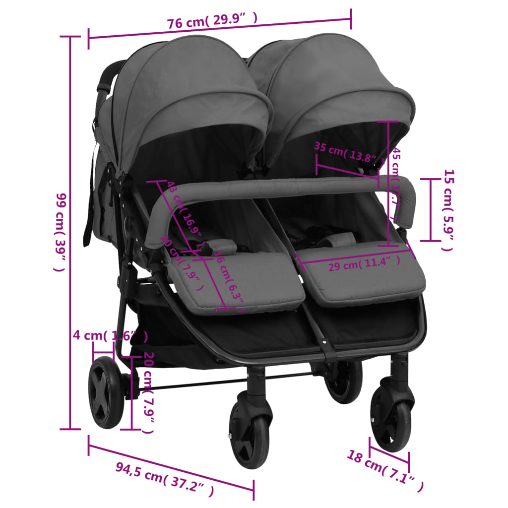 Este carrinho de bebé para gémeos acolhedor é perfeito para levar os seus filhos numa caminhada, a passear ou às compras. Este carrinho duplo apresenta uma construção em aço, tornando-o resistente e durável. O assento e o apoio de pés podem ser ajustados em diferentes posições para que os seus bebés possam descansar com todo o conforto. O arnês de 5 pontos garante a segurança dos bebés. O carrinho para gêmeos também possui um toldo para proteger contra os nocivos raios UV. O cesto inferior destina-se a guardar os artigos essenciais e os brinquedos do bebé. O carrinho dobrável pode ser rapidamente reduzido a um tamanho compacto, ideal para arrumação e transporte.