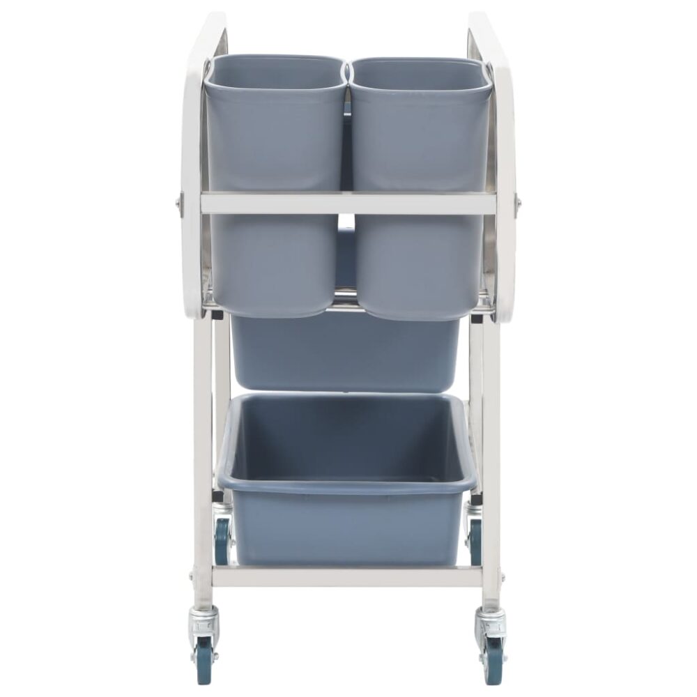 Este carrinho com recipientes de plástico é uma solução ideal para limpar a sala de jantar e transportar a loiça para a cozinha. Os recipientes de plástico fornecem amplo espaço para colocar os pratos e restos de comida. A estrutura em aço inoxidável mantém o carrinho estável e robusto, inclusive com a carga máxima. Graças às rodas que rodam suavemente, o carrinho pode ser pode ser deslocado sem esforço e silenciosamente. Além disso, duas das rodas têm travões para evitar que o carrinho se desloque sozinho, significando que também pode utilizá-lo para guardar ferramentas e outros produtos domésticos de uso diário. O carrinho é fácil de montar. A entrega inclui 1 carrinho, 2 recipientes pequenos e 3 grandes.