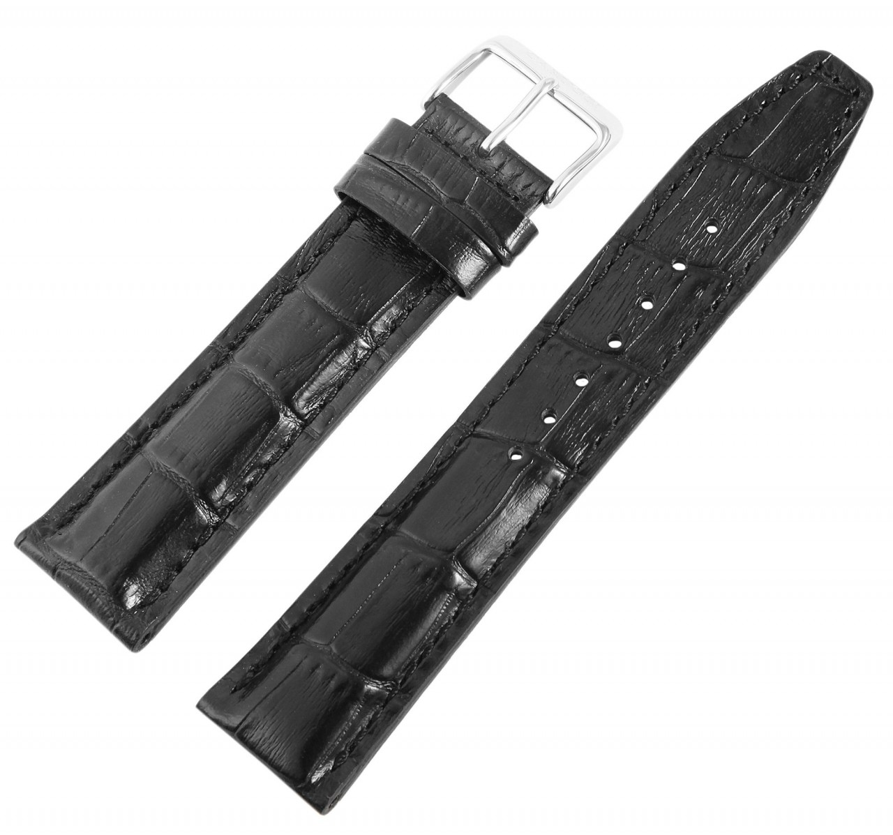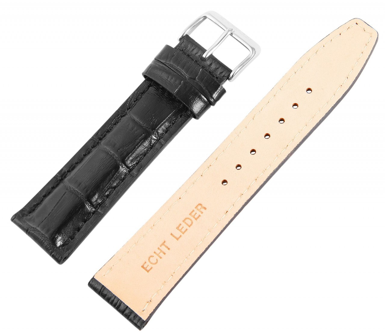 A pulseira preta da marca Carucci é feita de couro genuíno e tem uma largura de 22 mm. A alça do fecho é 2 mm mais estreita que a largura da alça porque a faixa é estreitamente estreita. A pulseira de substituição tem uma superfície lisa e brilhante e acabamento com uma fina costura preta que garante boa durabilidade e estabilidade. O comprimento total é de 22,5 cm e a espessura do material é de 5 mm. O comprimento consiste na parte do fecho com 10 cm de comprimento e na parte do furo com 12,5 cm de comprimento. A pulseira também pode ser aberta e fechada com uma fivela prateada altamente polida. O acabamento brilhante em combinação…