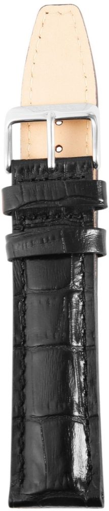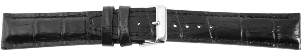 A pulseira preta da marca Carucci é feita de couro genuíno e tem uma largura de 22 mm. A alça do fecho é 2 mm mais estreita que a largura da alça porque a faixa é estreitamente estreita. A pulseira de substituição tem uma superfície lisa e brilhante e acabamento com uma fina costura preta que garante boa durabilidade e estabilidade. O comprimento total é de 22,5 cm e a espessura do material é de 5 mm. O comprimento consiste na parte do fecho com 10 cm de comprimento e na parte do furo com 12,5 cm de comprimento. A pulseira também pode ser aberta e fechada com uma fivela prateada altamente polida. O acabamento brilhante em combinação…