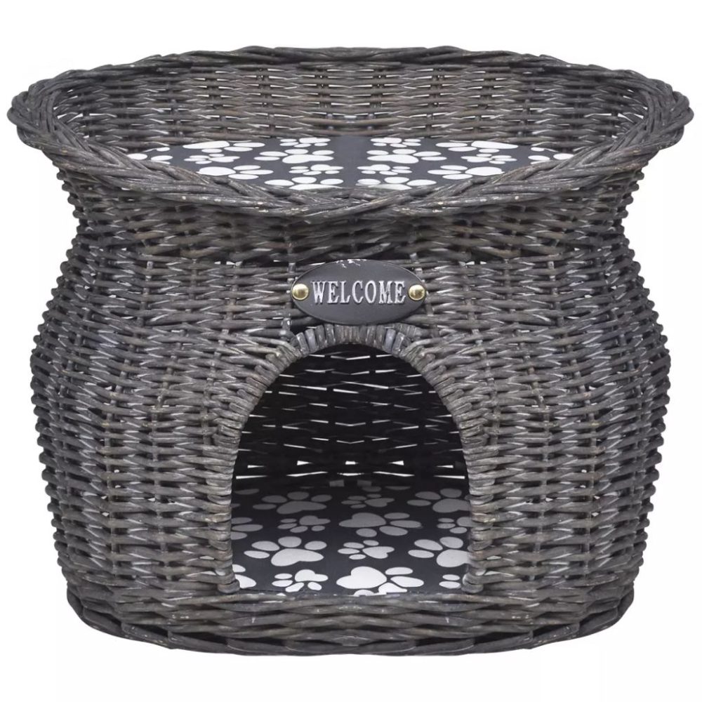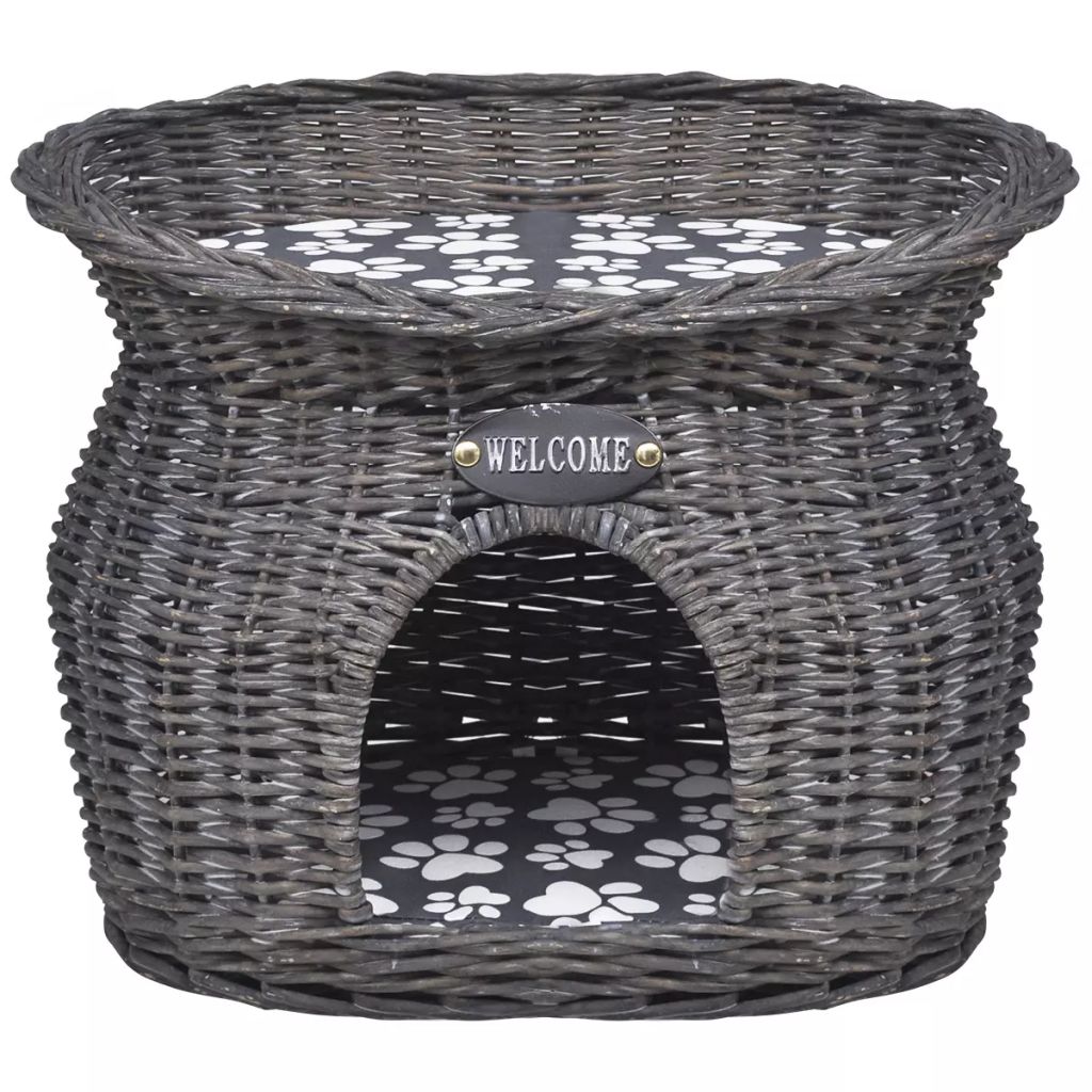 Esta é uma extravagante e elaborada cama de gato tecido.As almofadas macias densamente acolchoadas incluídas tornam-lo realmente acolhedor e confortável. Feita de salgueiro ambientalmente amigável, esta casa de estimação é resistente, mas leve o suficiente para levar junto.Esta casa de estimação também pode ser usada fora, no jardim ou no pátio, para o seu gato, gatinho, cachorro ou cachorro para dormir, descansar ou jogar. Os animais de estimação irão desfrutar do sol enquanto relaxam no último andar!