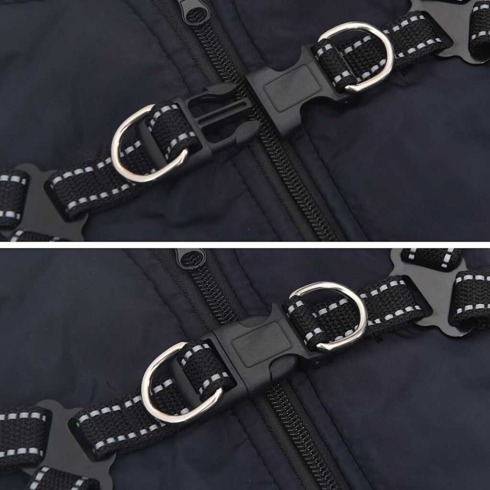 Mantenha o seu cão quente nos dias frios com este casaco acolhedor com um arnês incorporado! Impermeável e confortável: Este casaco de inverno para cão tem uma camada exterior impermeável para manter o seu animal seco, um forro de lã macio para o calor e acolchoamento extra para conforto.Arnês ajustável: Este casaco de passeio para cães possui alças ajustáveis para um ajuste perfeito, proporcionando o máximo conforto.Faixa refletora de segurança: Equipado com tiras refletoras, este colete para cães melhora a visibilidade em condições de pouca luz, garantindo a sua segurança e a do seu cão durante os passeios noturnos.Design de zíper conveniente: O design do zíper permite fácil ligar e desligar, simplificando o processo de roupa do seu animal de estimação e economizando tempo ao sair.Acessório D-ring: Os robustos D-rings são perfeitos para fixar com segurança uma coleira, proporcionando segurança adicional e tornando-o uma escolha ideal para caminhadas. Dica útil:Se a medida é entre tamanhos, ou se o seu cão é forte ou arbustivo. Sugerimos que compre um tamanho um pouco maior para se certificar de que se adapta confortavelmente ao seu cão.