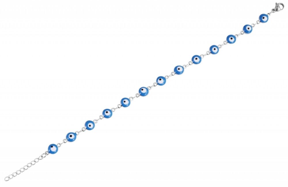 - O destaque especial são os vários pingentes coloridos de “mau-olhado” presos ao longo da corrente.
