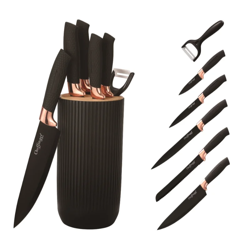 Com seu elegante revestimento antiaderente preto, limpar essas facas é muito fácil, economizando tempo e esforço na cozinha. O revestimento não só aumenta a durabilidade das facas, mas também adiciona um toque de sofisticação ao seu espaço culinário. Além disso, o acabamento em ouro rosa nas lâminas e o bloco de facas colorido semelhante a madeira criam um conjunto visualmente deslumbrante que elevará a estética de qualquer cozinha.
