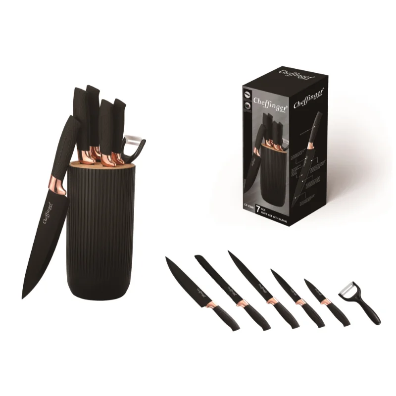 Eleve a sua experiência culinária com o Chefinger CF-KB01: Conjunto de facas de 7 peças, um conjunto versátil e elegante projetado para atender às diversas necessidades de corte de qualquer cozinha. Fabricadas em aço inoxidável de alta qualidade para alimentos, cada faca deste conjunto oferece durabilidade excepcional e corte preciso, garantindo que seus ingredientes sejam preparados com facilidade e precisão. O conjunto inclui uma vasta gama de lâminas, desde a faca de Chef de 20 cm até à faca de Parry de 9 cm, proporcionando-lhe a ferramenta perfeita para cada aplicação culinária.
