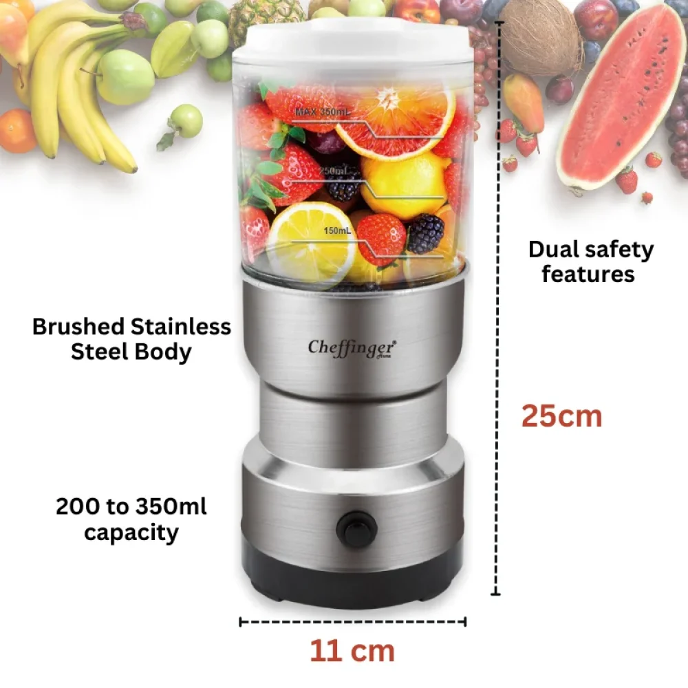 O Chefffinger CF-BW300 possui uma capacidade generosa de 350ml para misturar e 200ml para moer, tornando-o adequado para lotes pequenos e grandes. Esteja você preparando um smoothie matinal rápido ou organizando um jantar, este aparelho pode cuidar de tudo com facilidade. Além disso, seu moedor separado garante que você possa obter café, nozes e especiarias finamente moídos sem qualquer contaminação cruzada de sabores.
