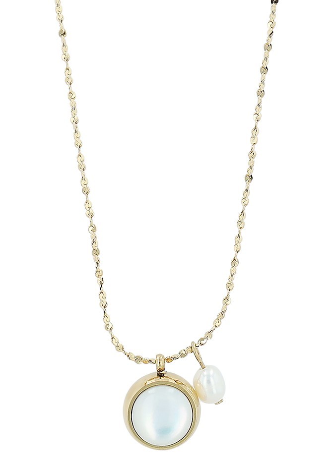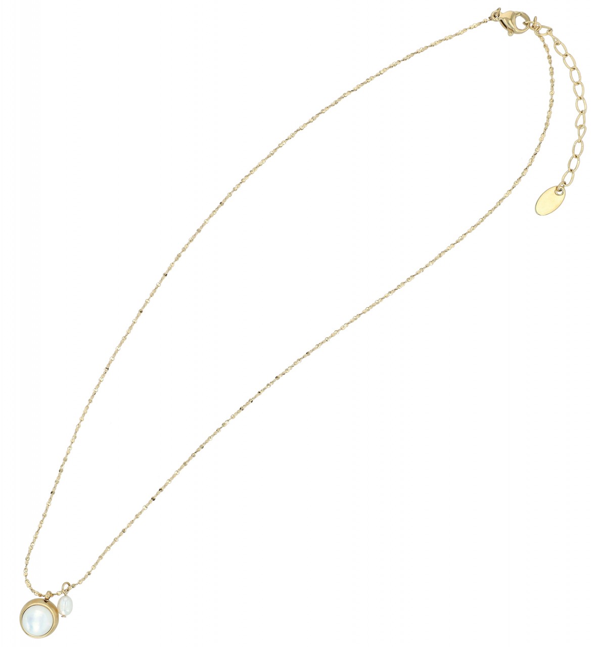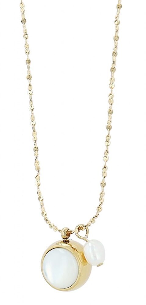 Feito de aço inoxidável de alta qualidade, nosso colar com dois pingentes incorpora não apenas elegância atemporal, mas também durabilidade e permanência. O aço inoxidável é resistente à corrosão e ao desbotamento, garantindo que a corrente mantenha sua beleza radiante mesmo após uso prolongado. O colar tem 41 cm de comprimento, com uma corrente de extensão adicional de 5 cm para personalização. O fecho seguro do mosquetão não só garante uma fixação firme, mas também um manuseio fácil. A peça central deste colar encantador é o pingente com aparência de madrepérola (Ø 10 mm), com um ornamento adicional na parte de trás e um segundo pingente pequeno com uma delicada pérola de água doce (8,5 x 4 mm). Os pingentes brancos irradiam uma beleza natural e dão ao colar uma elegância suave.