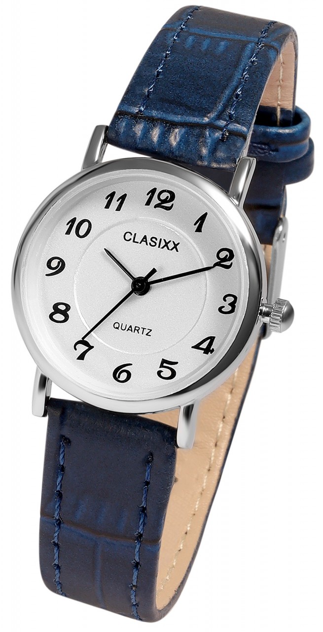 O relógio de pulso analógico de 3 ponteiros para senhora da marca Clasixx possui um movimento de quartzo de alta qualidade. A bracelete em Pele Sintética com relevo tem 14 mm de largura no lug e pode ser aberta e fechada com uma fivela de pino. O comprimento total do relógio é de 21 cm. A caixa metálica com vidro mineral tem um diâmetro de 27 mm e uma altura de 8 mm. O fundo da caixa é feito de aço inoxidável. O contraste de cores entre o mostrador brilhante e os ponteiros e índices pretos permite ver as horas num relance. Este modelo de senhora impressiona pelo seu design simples e é o companheiro ideal – tanto no quotidiano como em ocasiões festivas.