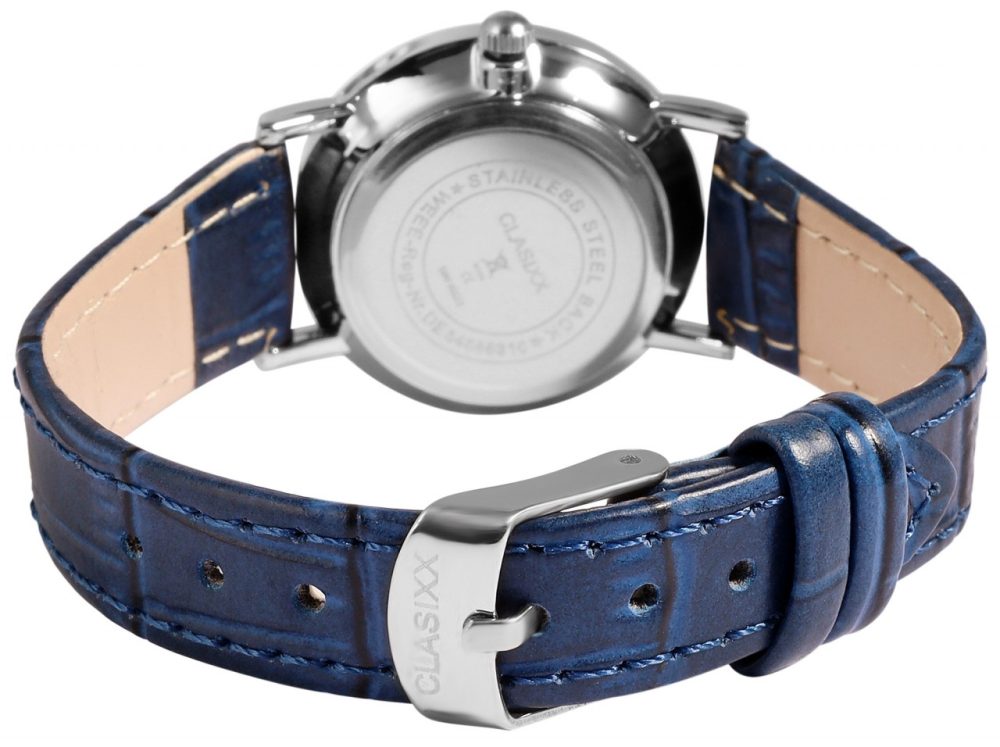 O relógio de pulso analógico de 3 ponteiros para senhora da marca Clasixx possui um movimento de quartzo de alta qualidade. A bracelete em Pele Sintética com relevo tem 14 mm de largura no lug e pode ser aberta e fechada com uma fivela de pino. O comprimento total do relógio é de 21 cm. A caixa metálica com vidro mineral tem um diâmetro de 27 mm e uma altura de 8 mm. O fundo da caixa é feito de aço inoxidável. O contraste de cores entre o mostrador brilhante e os ponteiros e índices pretos permite ver as horas num relance. Este modelo de senhora impressiona pelo seu design simples e é o companheiro ideal – tanto no quotidiano como em ocasiões festivas.