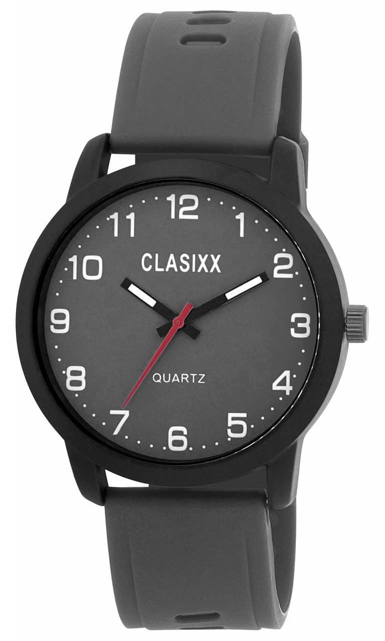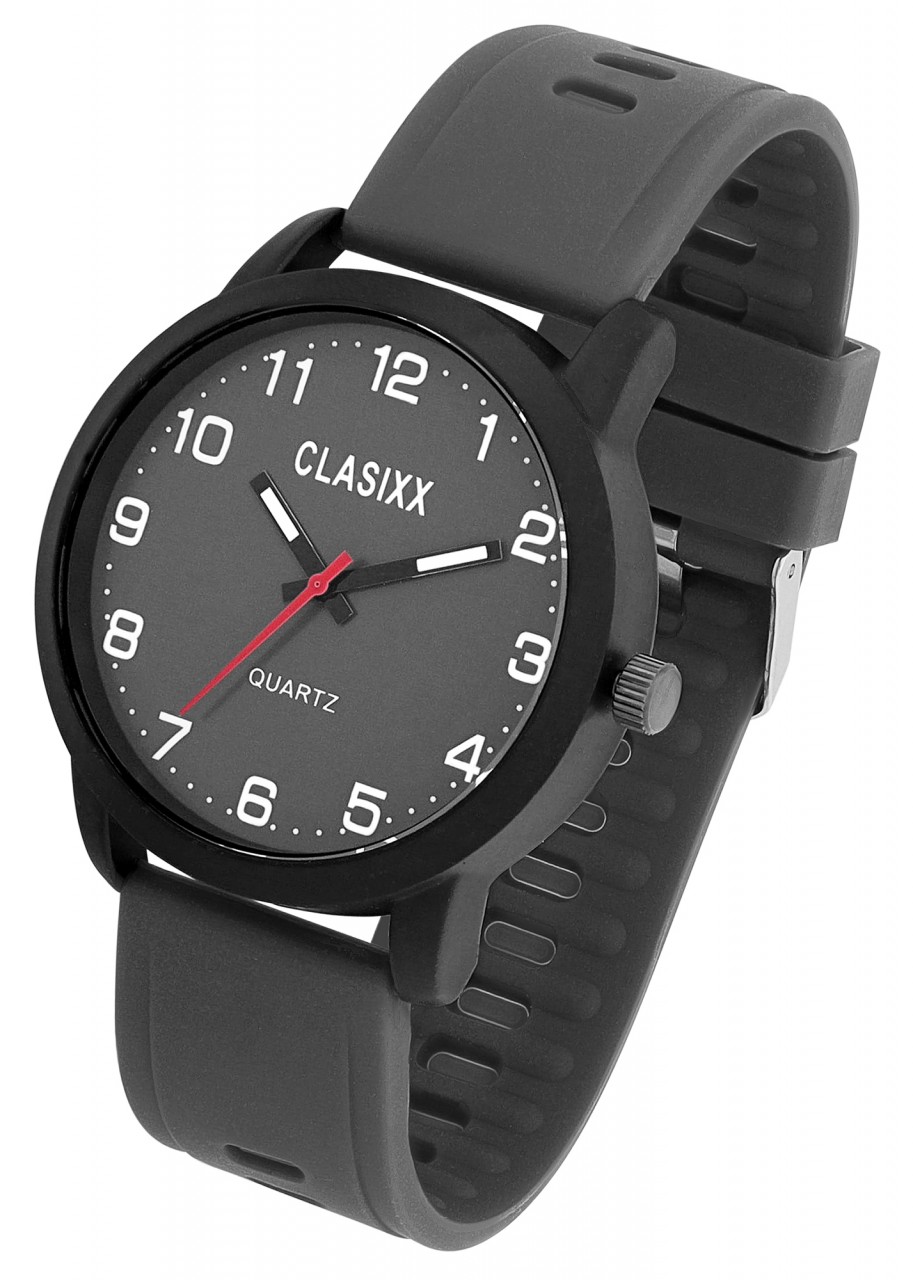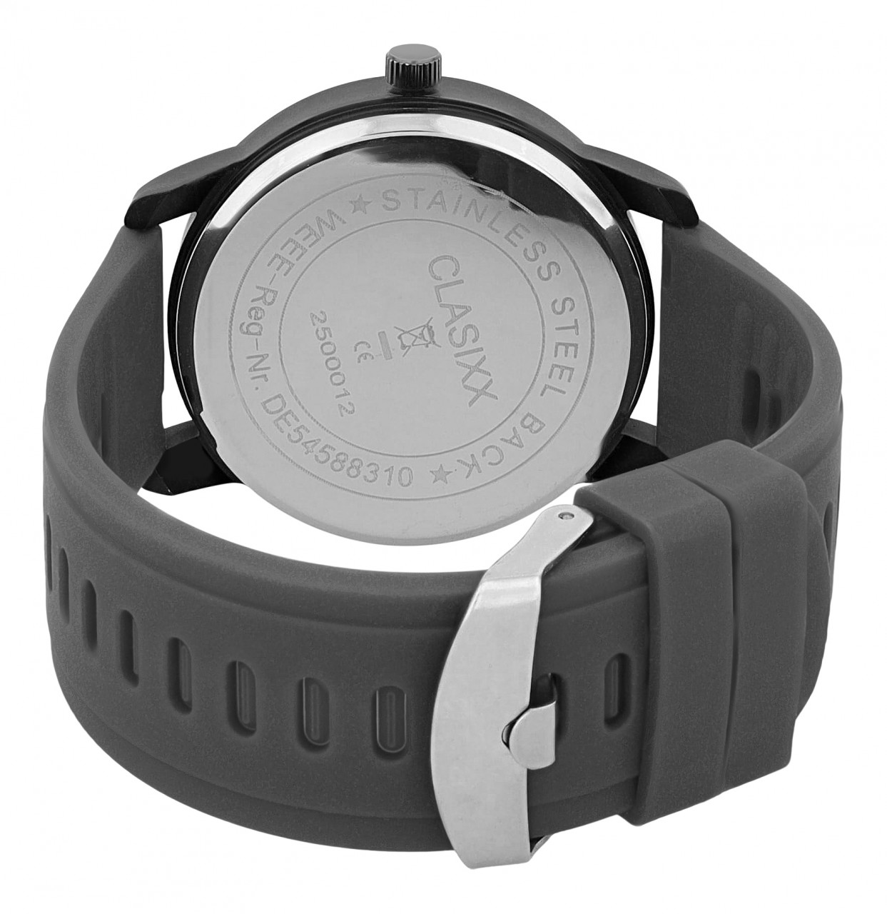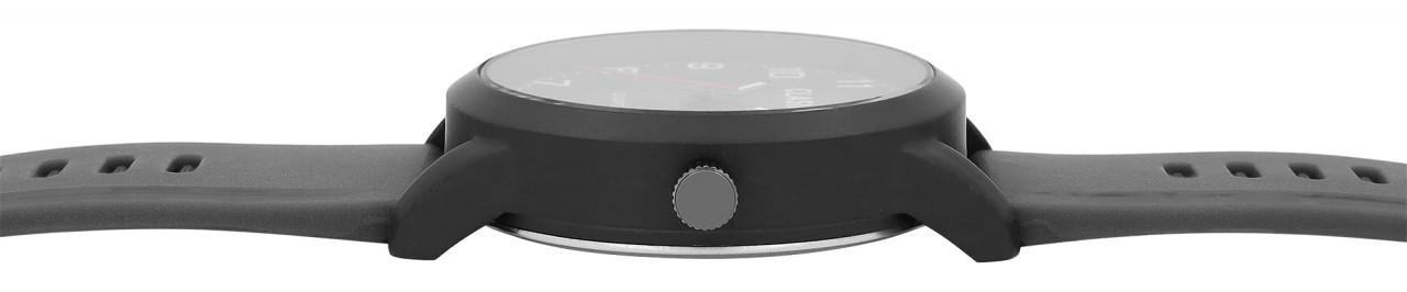 Um relógio para homem com uma bracelete de silicone confortável e uma caixa metálica robusta em preto (fundo em aço inoxidável).