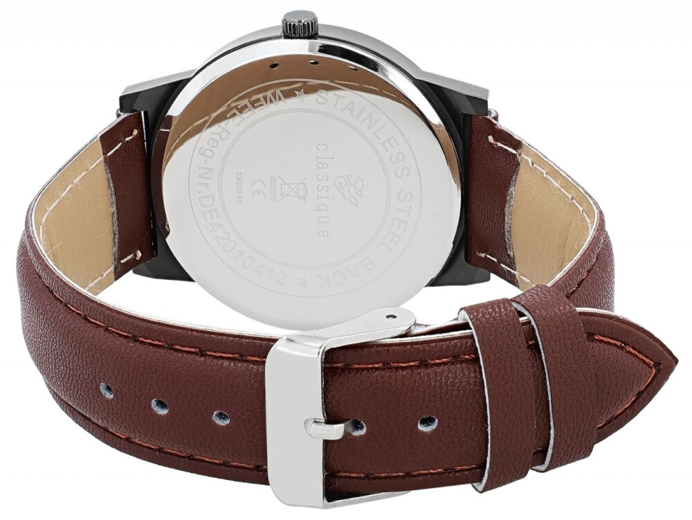 O relógio de pulso masculino analógico de 3 ponteiros da marca Classique apresenta um movimento de quartzo de alta qualidade. A pulseira de couro sintético tem 20 mm de largura nas hastes e afunila 2 mm, de modo que a largura do fecho é de 18 mm. O relógio pode ser aberto e fechado com uma fivela de pino. O comprimento total do relógio é de 25 cm. A caixa de metal com vidro mineral tem um diâmetro de 40 mm e uma altura de 9 mm. O fundo da caixa é feito de aço inoxidável. O mostrador simples tem uma cor contrastante para que a hora possa ser lida rapidamente. O relógio também está disponível em diferentes versões. O relógio de pulso é o acessório perfeito para qualquer look, pois seu estilo clássico combina com qualquer ocasião.