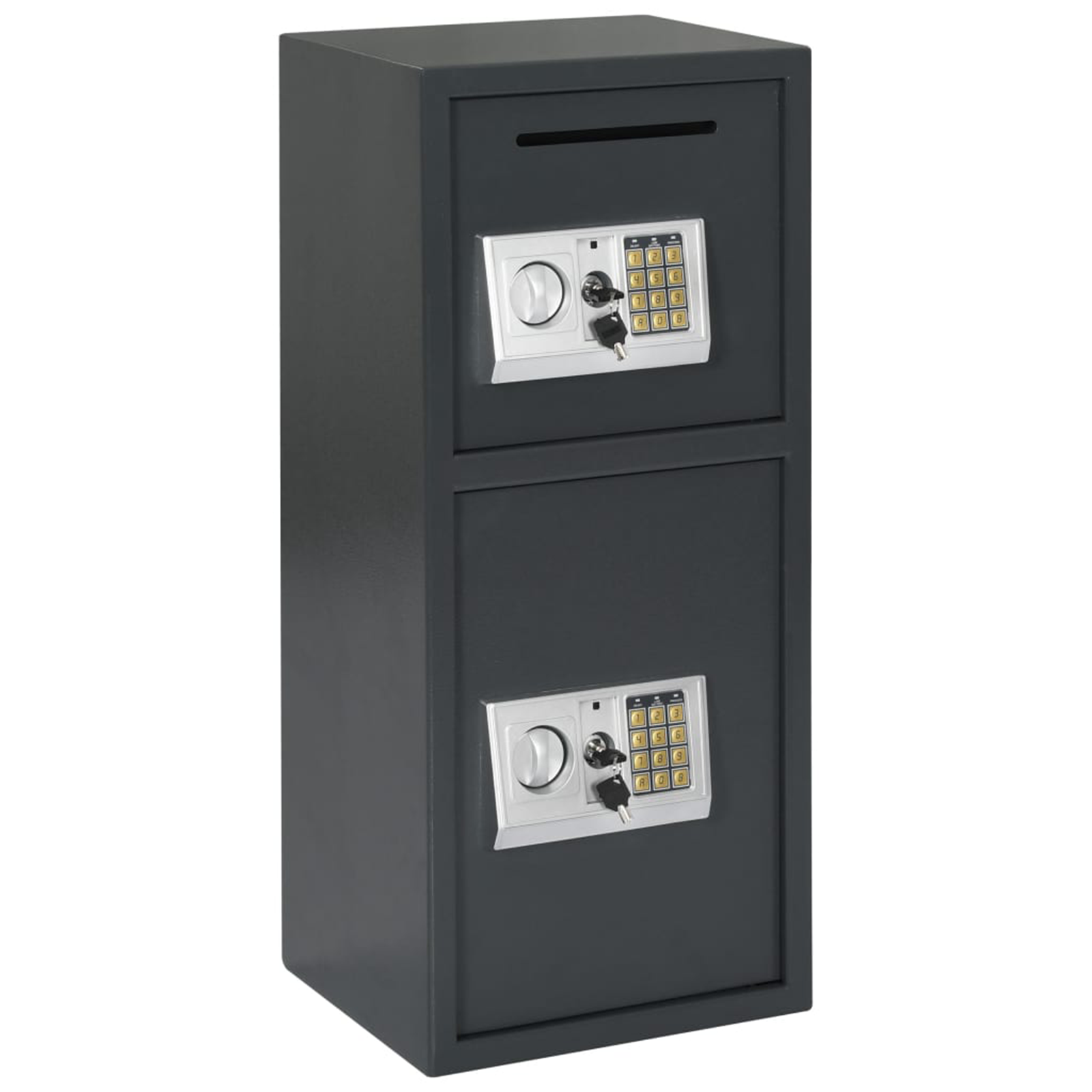 - Com o seu elegante visual cinza escuro e muito espaço para armazenar, mantém os teus valores seguros contra furtos enquanto se adapta bem à decoração.
