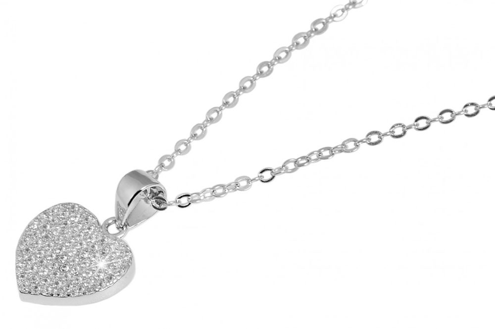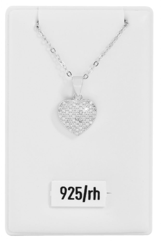 O colar feito em prata de lei 925/- é feito em padrão âncora e tem comprimento total de 43 cm incluindo uma corrente extensora de 5 cm de comprimento. Há um pingente de prata real em forma de coração preso à corrente, que é totalmente cravejado com cerca de 50 pedras brilhantes de zircônia. O pingente tem comprimento de 12 mm, largura de 11 mm e espessura de 2 mm. Tanto a…