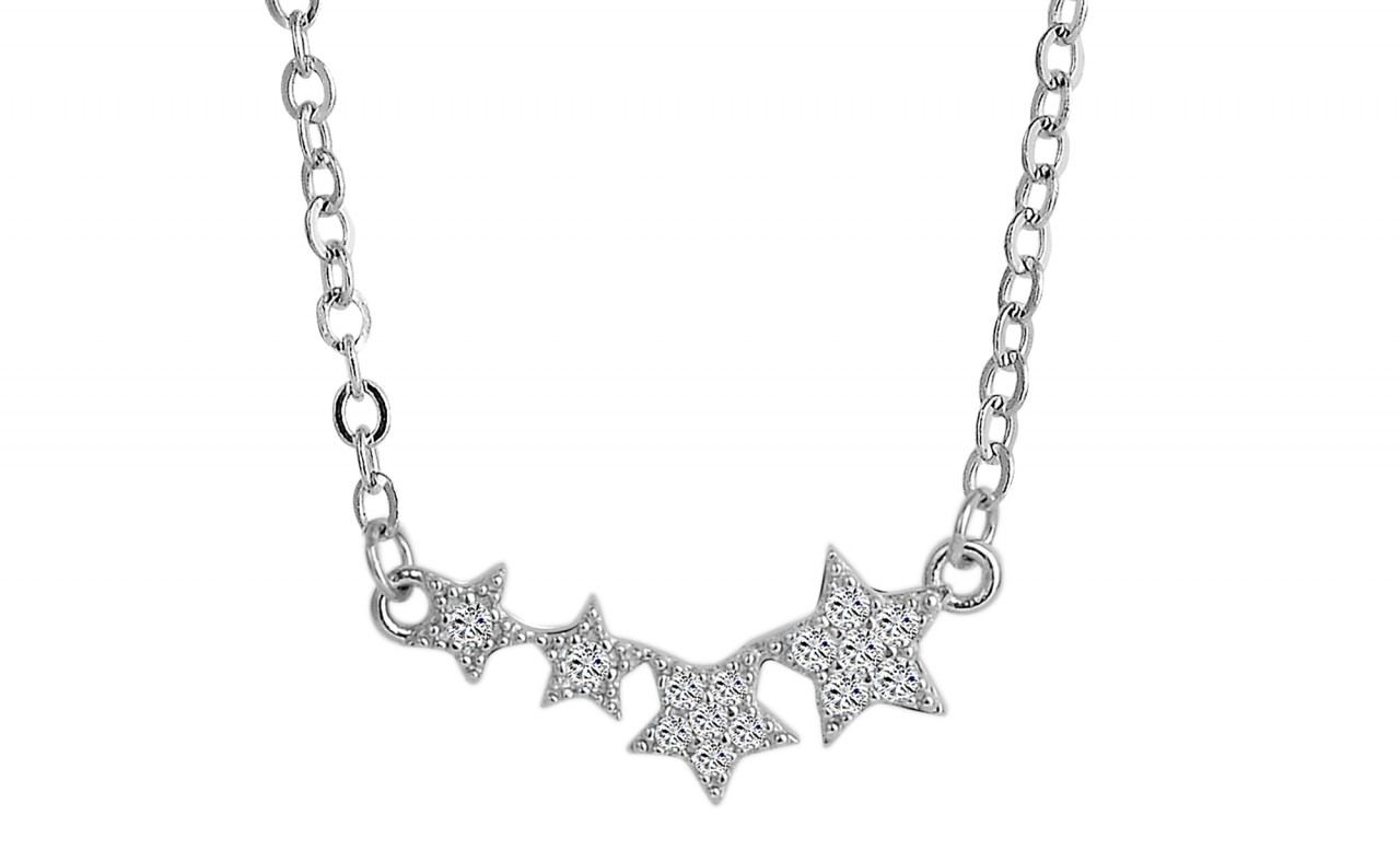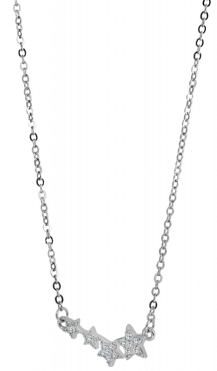 O colar feito em prata de lei 925/- é feito em padrão âncora e tem comprimento total de 45 cm incluindo uma corrente de extensão de 3 cm de comprimento. Há uma fileira de estrelas no meio da corrente, decoradas com 14 pedras brilhantes de zircônia. O colar é preso ao pescoço com um mosquetão. Tanto a corrente quanto o pingente são adicionalmente refinados com um revestimento de ródio de alta qualidade. Isso protege a joia de manchas e confere um brilho adicional radiante e duradouro. Este colar é perfeito para quem quer adicionar uma magia muito especial ao seu look.