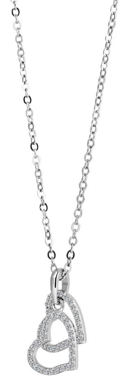 O colar feminino com dois pingentes de coração é feito em prata de lei 925 e banhado a ródio. Graças ao revestimento de ródio de alta qualidade, o material fica protegido contra manchas e possui brilho radiante. Ambos os pingentes são decorados com pedras brilhantes de zircônia na borda do coração e impressionam pelo design lúdico, em que os pingentes se entrelaçam. Têm comprimento de 10 mm, largura de 11 mm e…