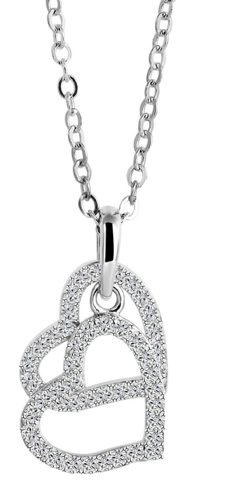 O colar feminino com dois pingentes de coração é feito em prata de lei 925 e banhado a ródio. Graças ao revestimento de ródio de alta qualidade, o material fica protegido contra manchas e possui brilho radiante. Ambos os pingentes são decorados com pedras brilhantes de zircônia na borda do coração e impressionam pelo design lúdico, em que os pingentes se entrelaçam. Têm comprimento de 10 mm, largura de 11 mm e…
