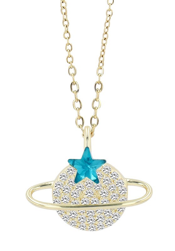 O colar em prata 925 com banho de ouro é um ótimo chamariz para qualquer decote. O pendente em forma de planeta mede 13 x 16,5 x 7 mm e é uma obra de arte impressionante. Cravejado com 44 zircónias brancas, o pendente é um verdadeiro chamariz. No entanto, o pormenor mais fascinante desta criação é a zircónia azul em forma de estrela, que parece flutuar à frente do planeta no ilhó do pendente. Como uma estrela solitária, irradia uma elegância fresca e cria um contraste extraordinário com a zircónia cúbica branca radiante do planeta. O colar de beleza intemporal tem 40 cm de comprimento e oferece uma extensão adicional de 3,5 cm. O colar é fechado com um fecho de lagosta. Adequado para qualquer roupa e ocasião, confere um toque de elegância e beleza celestial.
