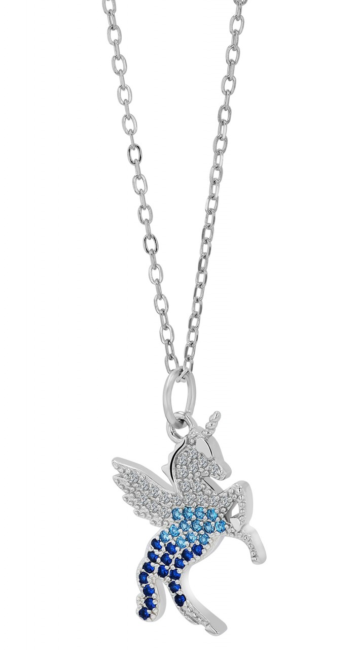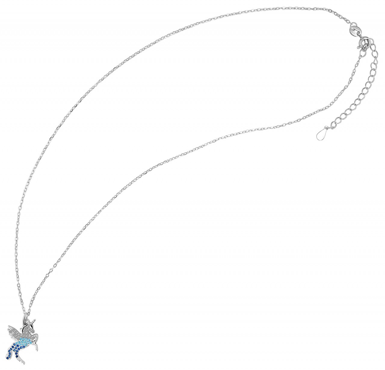 Uma peça de joalharia que fará bater mais depressa os corações dos jovens e dos velhos sonhadores. O colar é feito de prata de lei pura 925/-, que não só representa uma beleza intemporal, mas também durabilidade e compatibilidade com a pele. Com uma largura de 1 mm e uma espessura de 0,5 mm, o colar oferece um toque delicado, mas robusto e resistente. O fecho lagosta garante uma fixação segura e facilita a colocação e a retirada. O destaque deste colar é o encantador pendente de unicórnio. Com 13 x 20 x 2 mm, brilha com pedras de zircónio brancas e azuis que conferem ao unicórnio um brilho mágico.