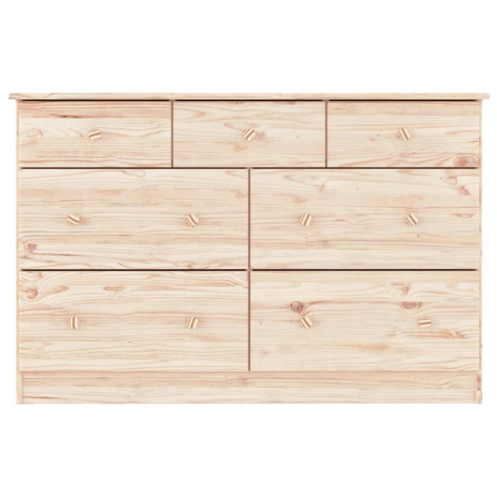 Esta cómoda em madeira, com um aspeto intemporal, destina-se a ser um excelente complemento para a sua casa. Madeira de pinho maciça: a madeira de pinho maciça é um bonito material natural. A madeira de pinho possui um grão reto e os nós conferem ao material o seu aspeto rústico. Feito em madeira de pinho maciça, o armário com gavetas é durável e resistente.Amplo espaço de arrumação: o móvel de arrumação possui 7 gavetas de diferentes, oferecendo um amplo espaço para as suas diferentes necessidades de armazenamento e mantendo as suas coisas organizadas.Puxadores de madeira: o móvel possui puxadores de madeira que fazem com que seja mais fácil abrir e fechar as gavetas, ao mesmo tempo que atribuem uma beleza adicional.Fácil de cuidar: o armário com gavetas é fácil de limpar com um pano húmido e requer menos manutenção.Superfície não tratada: como a cómoda foi concebida a partir de madeira de pinho maciça sem acabamento, poderá manter a sua cor natural ou poderá pintá-la e envernizá-la de acordo com as suas preferências. Atenção:Para evitar que o produto se vire, deve utilizar o dispositivo de fixação na parede fornecido.