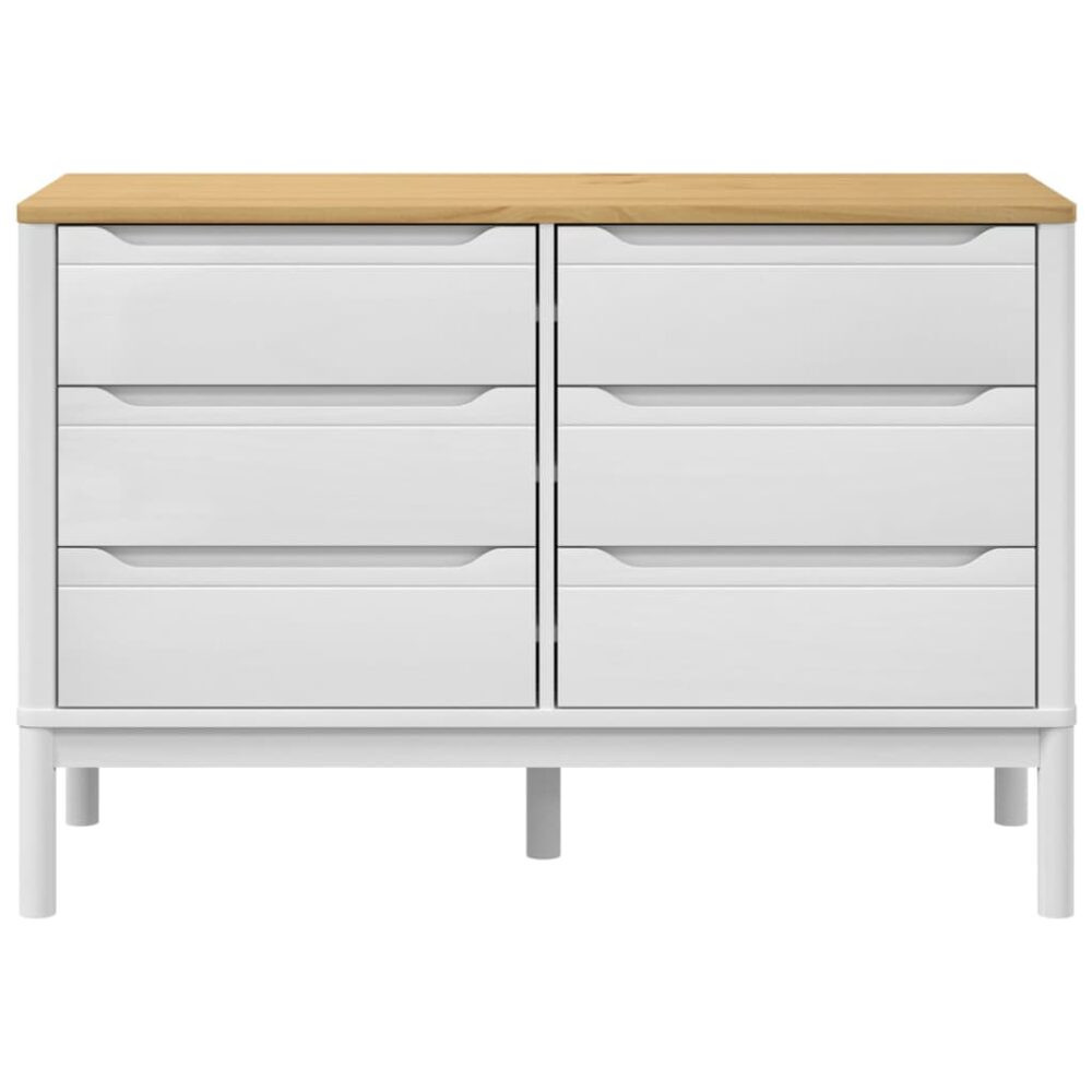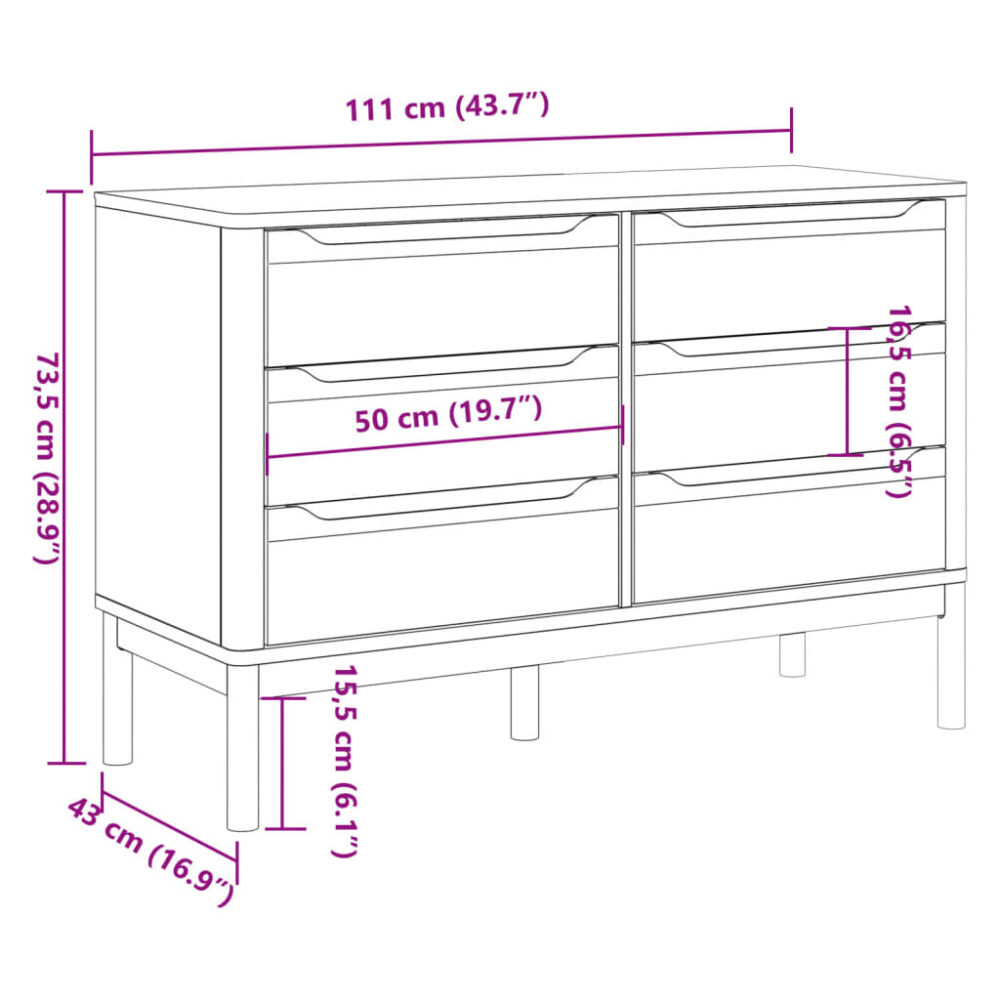 Esta cómoda clássica, com um aspeto intemporal, destina-se a ser um excelente complemento para a sua casa. Madeira de pinho maciça: a madeira de pinho maciça é um bonito material natural. A madeira de pinho possui um grão reto e os nós conferem ao material o seu aspeto rústico. Feito em madeira de pinho maciça, o armário de arrumação é durável e resistente.Espaço de arrumação amplo: o móvel de arrumação com 6 gavetas oferece um amplo espaço de arrumação para manter vários artigos essenciais do dia-a-dia bem organizados e fáceis de alcançar.Função de exposição: o tampo do armário aparador é ótimo para expor os seus artigos decorativos, álbuns de fotografias ou pequenas plantas.Pernas de madeira: as pernas em madeira conferem ao produto um aspeto natural e agradável, ao mesmo tempo que garantem estabilidade. Combina com qualquer decoração de interior. Atenção:Para evitar que o produto tombe, deve utilizar o dispositivo de fixação na parede (não fornecido).