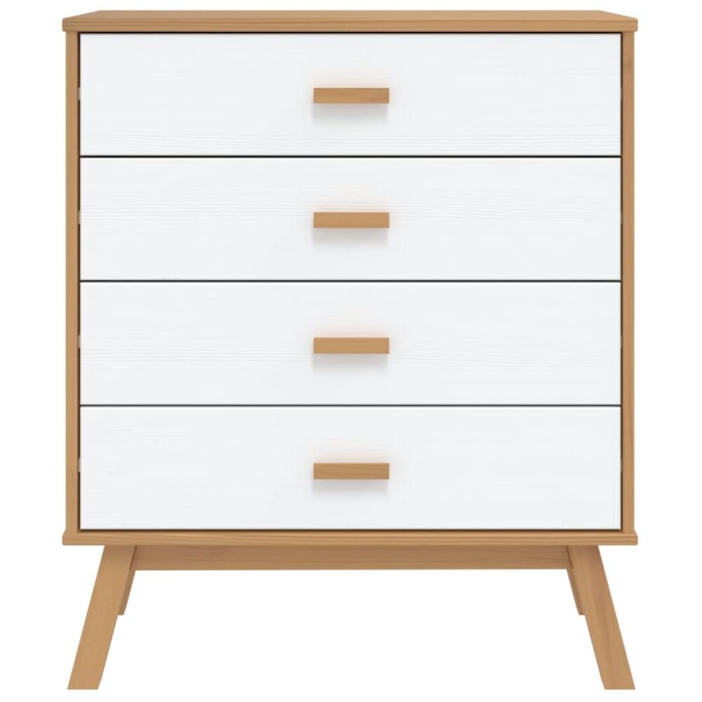 Este elegante armário de gavetas em madeira, que exala um charme escandinavo, será o centro das atenções no seu interior. Madeira de pinho maciça: a madeira de pinho maciça é um bonito material natural. A madeira de pinho possui um grão reto e os nós conferem ao material o seu aspeto rústico. Feita em madeira de pinho maciça, a cómoda com gavetas é durável e resistente.Amplo espaço de arrumação: o armário de arrumação possui 4 gavetas, oferecendo um amplo espaço de armazenamento para manter os seus artigos bem organizados e ao alcance.Função de exposição: o tampo robusto do aparador é ideal para expor objetos decorativos, molduras ou vasos com plantas.Pés de madeira: os pés de madeira conferem ao móvel de entrada um aspeto natural e agradável, ao mesmo tempo que garantem estabilidade. Combina bem com qualquer decoração de interior. Atenção:Para evitar que tombe, este produto deve ser utilizado com o dispositivo de fixação na parede fornecido.