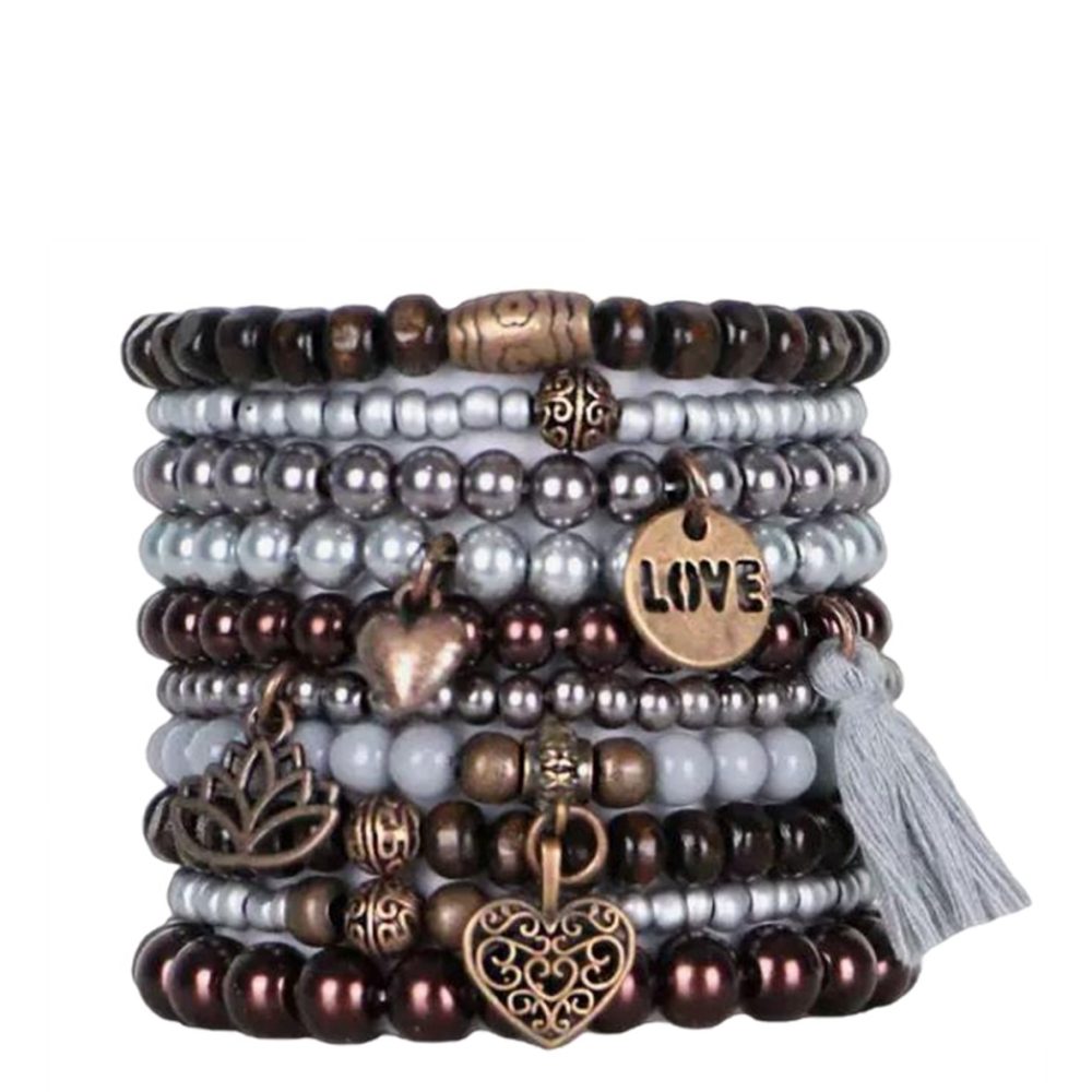 Os conjuntos de pulseiras Bohemian são feitos a partir de uma variedade de contas de vidro, madeira, liga e semi-preciosas.