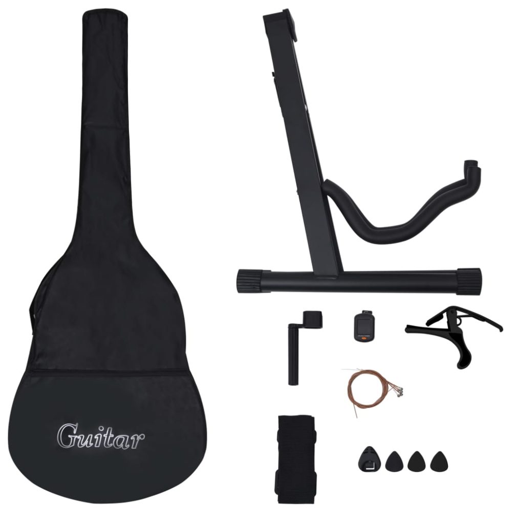 A nossa guitarra clássica é um ótimo instrumento para iniciantes, amadores e músicos de qualquer nível. Para além da guitarra, a entrega inclui uma mala para a guitarra, correia, palhetas, porta-palhetas, conjunto de cordas de guitarra, manivela de cordas, capo, afinador cromático e suporte de guitarra.