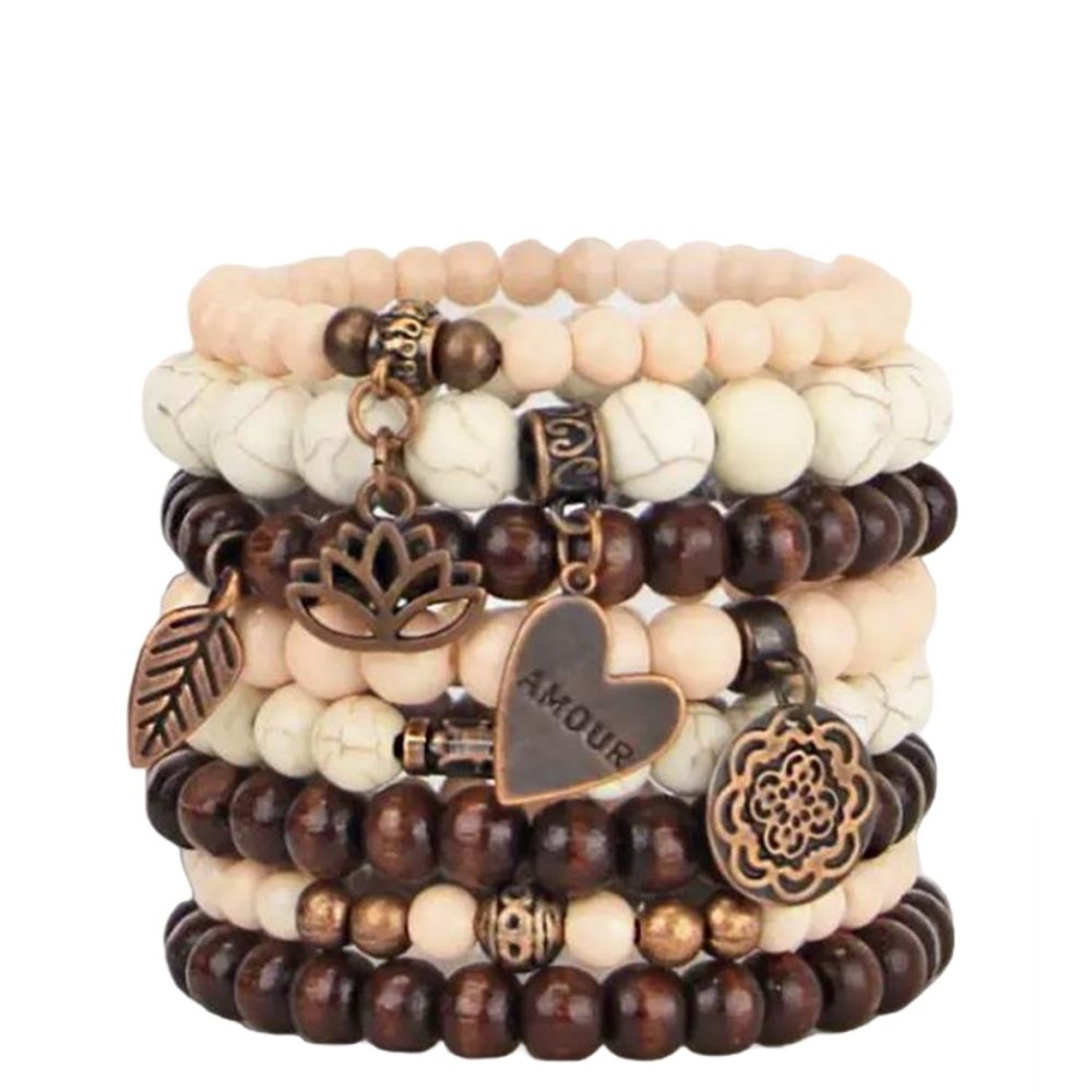 Os conjuntos de pulseiras Bohemian são feitos a partir de uma variedade de contas de vidro, madeira, liga e semi-preciosas.
