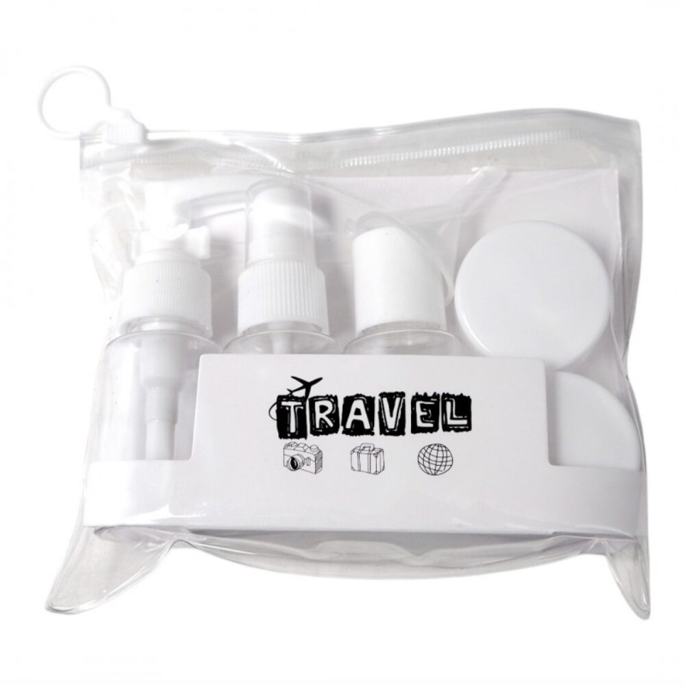 Um conjunto de frascos e recipientes de 7 peças, especialmente concebido para transportar cosméticos em viagens.