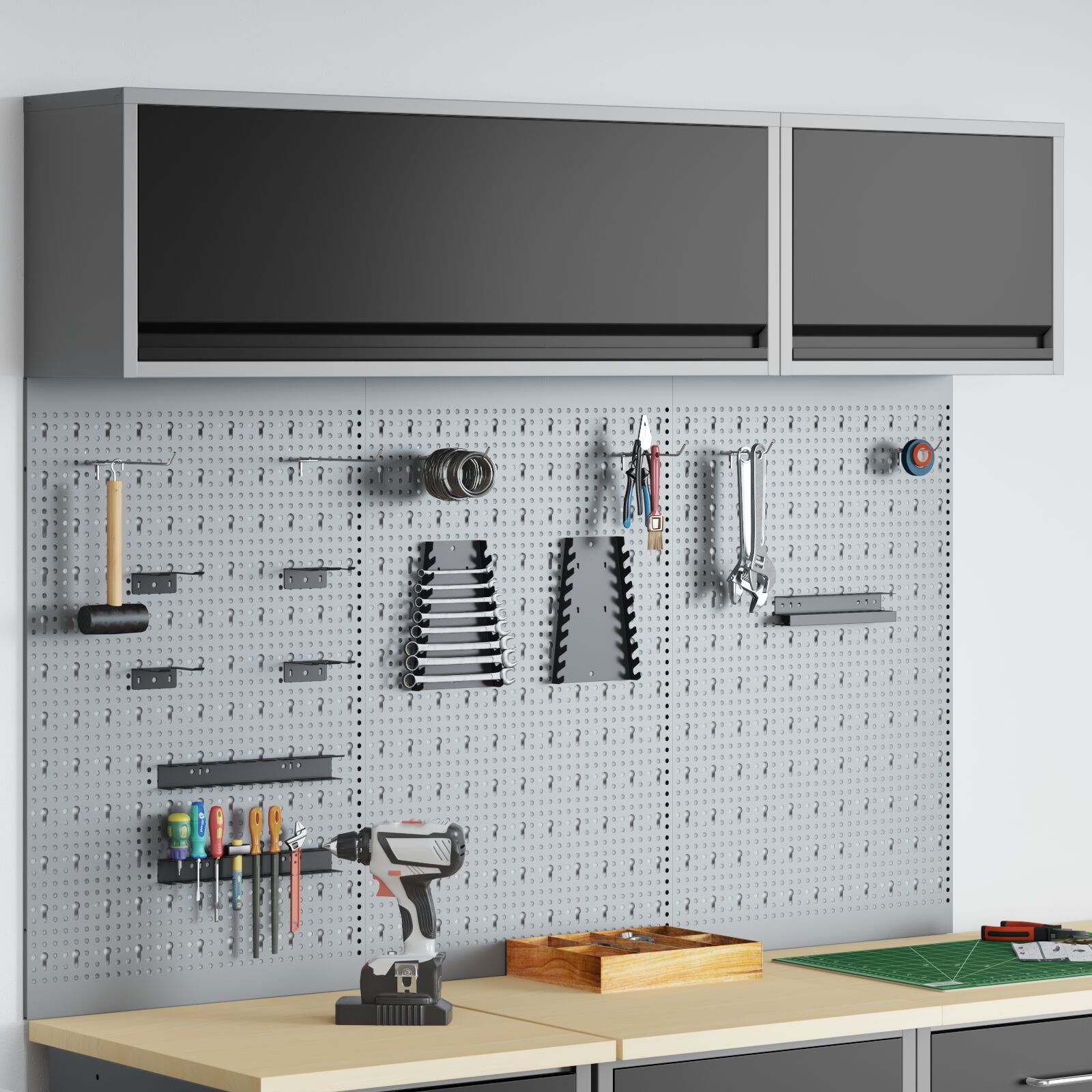 O Conjunto de Organizador de Ferramentas Industrial junta utilidade e estilo. Com vrios armrios de ao robustos e painis de pegboard, perfeito para manter o espao de trabalho arrumado, ideal para qualquer garagem ou oficina. Para profissionais ou entusiastas do ‘faa tu mesmo’, os armrios aguentam ferramentas pesadas, enquanto os painis oferecem espao extra para diversos itens. Com um acabamento fosco, suporta cargas pesadas e mantm um aspeto bonito. Investe nesta soluo de organizao de ferramentas bem pensada e melhora o teu espao de trabalho.
