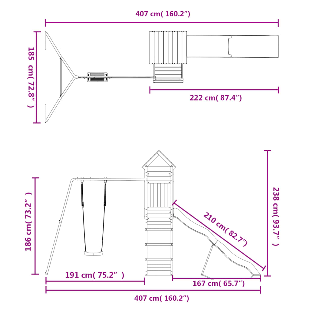 Quer dar às suas crianças a liberdade de poderem brincar em casa? Este conjunto de brincar para exterior em madeira transforma o seu quintal num parque infantil para aventuras imaginativas! Madeira de pinho maciça: esta estrutura de escalar para jardim é feita em madeira de pinho maciça. A madeira de pinho maciça é um bonito material natural. A madeira de pinho possui um grão reto e os nós conferem ao material o seu aspeto rústico.Estrutura robusta e estável: a estrutura de madeira do conjunto de brincar assegura resistência e estabilidade. Para além disso, as pernas em forma de A do baloiço para crianças oferecem equilíbrio.Centros multi-atividades: o equipamento de parque infantil inclui uma plataforma com 118 cm de altura e destaca-se pelo seu escorrega ondulado, um conjunto individual de baloiço, bem como pela caixa de areia. Os seus pequenitos também podem convidar os seus amigos para se juntarem à diversão.Design bem pensado: os corrimões de madeira circundantes foram concebidos para assegurarem a segurança das crianças durante as suas brincadeiras felizes. Para além disso, o telhado de madeira proporciona sombra às crianças durante os dias quentes de verão.Diversão sem fim: este conjunto de brincar em madeira proporciona imensa diversão e é a forma perfeita das suas crianças e dos seus amigos se divertirem, terem mais tempo para interagir e para criar memórias para eles e para si! Atenção:Apenas para utilização domésticaUtilização ao ar livreNão é adequada para crianças com menos de 3 anos de idadeIdade recomendada do utilizador: 3-8 anosPeso máximo por utilizador: 45 kg Nota:O produto deve ser ancorado para reduzir o perigo de queda. As âncoras não estão incluídas.