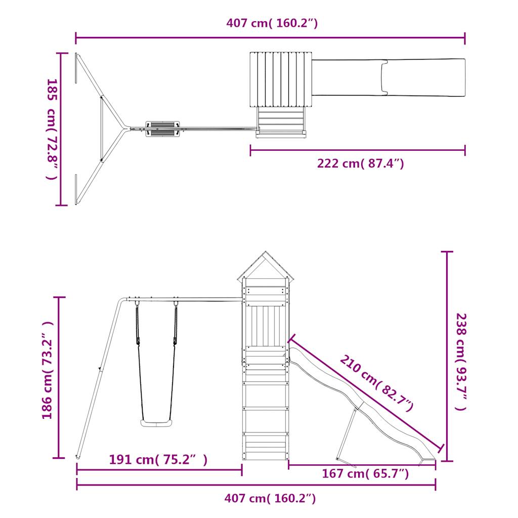 Quer dar às suas crianças a liberdade de poderem brincar em casa? Este conjunto de brincar para exterior em madeira transforma o seu quintal num parque infantil para aventuras imaginativas! Madeira de douglas maciça: esta estrutura de escalar para jardim é feita em madeira de douglas maciça. A madeira de douglas maciça é uma madeira altamente durável que se adapta bem em ambientes exteriores. A madeira de douglas é ainda forte e requer pouca manutenção, mesmo durante a ação das intempéries.Estrutura robusta e estável: a estrutura de madeira do conjunto de brincar assegura resistência e estabilidade. Para além disso, as pernas em forma de A do baloiço para crianças oferecem equilíbrio.Centros multi-atividades: o equipamento de parque infantil inclui uma plataforma com 118 cm de altura e destaca-se pelo seu escorrega ondulado, um conjunto individual de baloiço, bem como pela caixa de areia. Os seus pequenitos também podem convidar os seus amigos para se juntarem à diversão.Design bem pensado: os corrimões de madeira circundantes foram concebidos para assegurarem a segurança das crianças durante as suas brincadeiras felizes. Para além disso, o telhado de madeira proporciona sombra às crianças durante os dias quentes de verão.Diversão sem fim: este conjunto de brincar em madeira proporciona imensa diversão e é a forma perfeita das suas crianças e dos seus amigos se divertirem, terem mais tempo para interagir e para criar memórias para eles e para si! Atenção:Apenas para utilização domésticaUtilização ao ar livreNão é adequada para crianças com menos de 3 anos de idadeIdade recomendada do utilizador: 3-8 anosPeso máximo por utilizador: 45 kg Nota:O produto deve ser ancorado para reduzir o perigo de queda. As âncoras não estão incluídas.