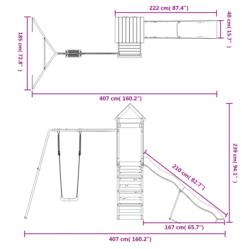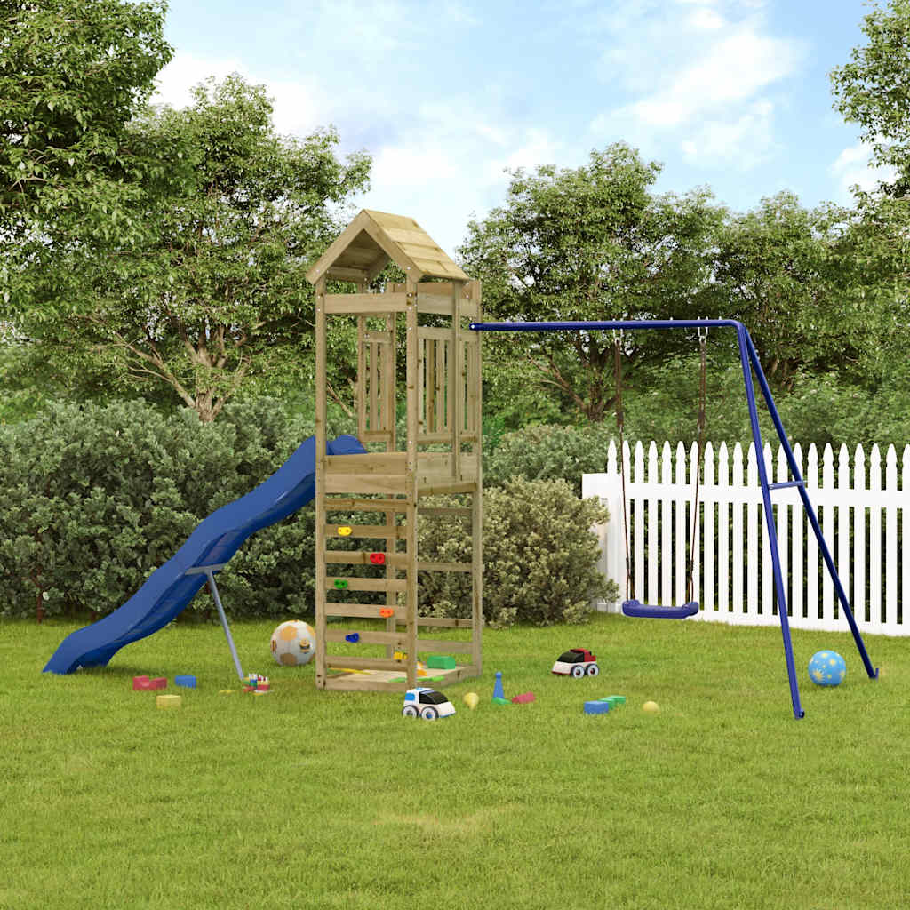 Quer dar às suas crianças a liberdade de poderem brincar em casa? Este conjunto de brincar para exterior em madeira transforma o seu quintal num parque infantil para aventuras imaginativas! Madeira impregnada: esta estrutura de escalar para jardim é feita em madeira de pinho impregnada por vácuo-pressão. A madeira de pinho maciça é um bonito material natural. A madeira de pinho possui um grão reto e os nós conferem ao material o seu aspeto rústico. A impregnação é um processo de preservação que é levado a cabo através da utilização de autoclaves. O tratamento sob pressão aumenta a resistência à decomposição e às intempéries.Estrutura robusta e estável: a estrutura de madeira do conjunto de brincar assegura resistência e estabilidade. Para além disso, as pernas em forma de A do baloiço para crianças oferecem equilíbrio.Centros multi-atividades: o equipamento de parque infantil inclui uma plataforma com 118 cm de altura e destaca-se pela sua parede de escalar, escorrega ondulado, um conjunto individual de baloiço, bem como pela caixa de areia. Os seus pequenitos também podem convidar os seus amigos para se juntarem à diversão. Design bem pensado: os corrimões de madeira circundantes foram concebidos para assegurarem a segurança das crianças durante as suas brincadeiras felizes. Para além disso, o telhado de madeira proporciona sombra às crianças durante os dias quentes de verão.Diversão sem fim: este conjunto de brincar em madeira proporciona imensa diversão e é a forma perfeita das suas crianças e dos seus amigos se divertirem, terem mais tempo para interagir e para criar memórias para eles e para si! Atenção:Apenas para utilização domésticaUtilização ao ar livreNão é adequada para crianças com menos de 3 anos de idadeIdade recomendada do utilizador: 3-8 anosPeso máximo por utilizador: 45 kg Nota:O produto deve ser ancorado para reduzir o perigo de queda. As âncoras não estão incluídas.