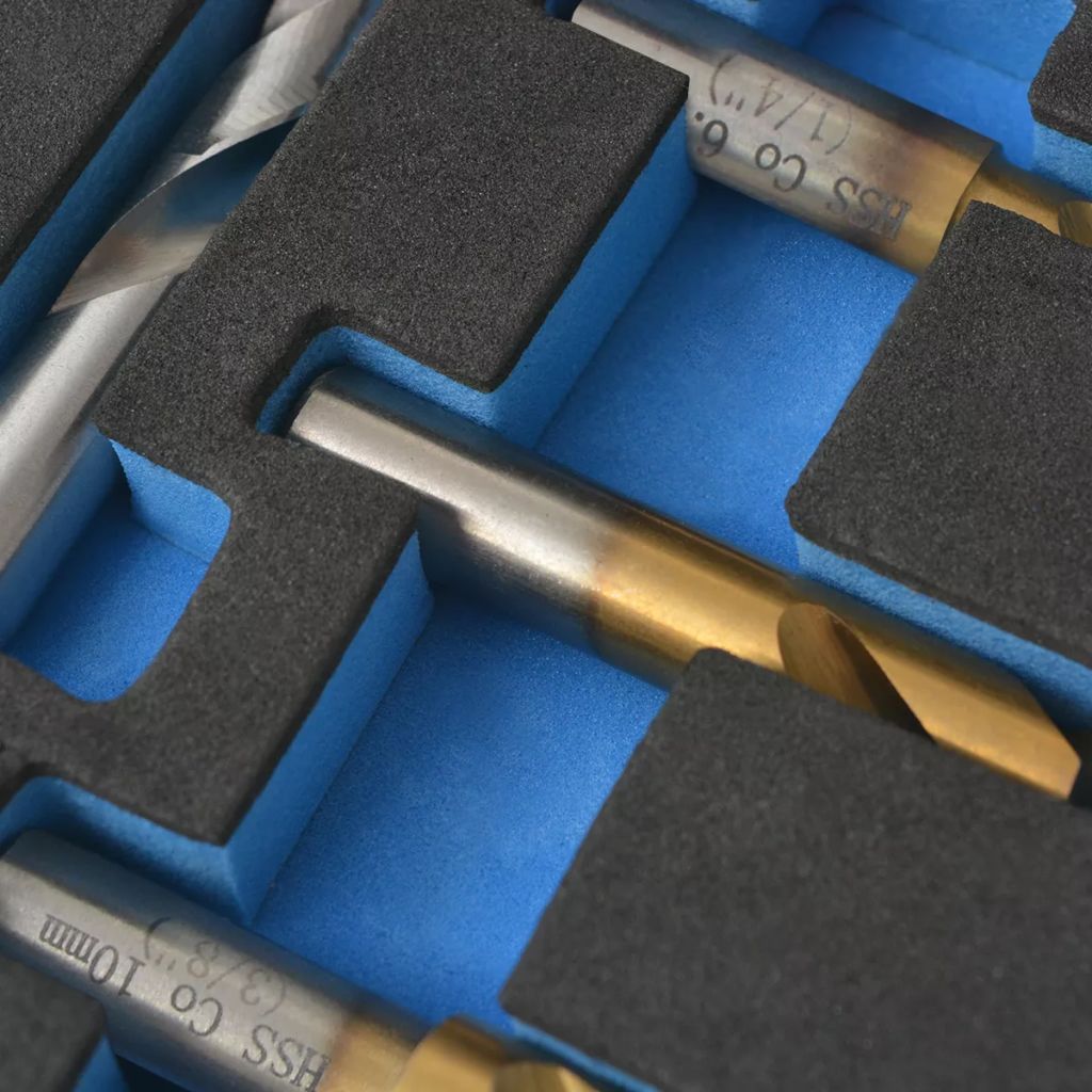 O conjunto de brocas foi fabricado a partir de HSS de alta qualidade que contém cobalto, para aumentar a resistência ao calor, tornando-o perfeito para uso em metais mais duros tais como aço inoxidável. As brocas são entregues numa caixa robusta para fácil armazenamento e transporte.