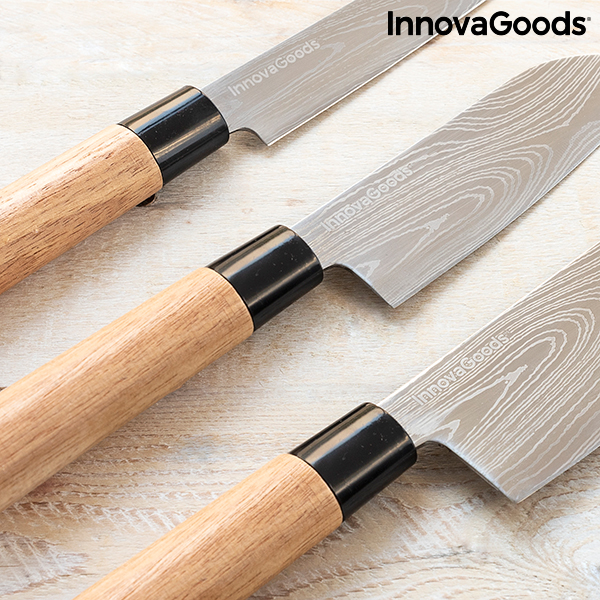 - 3 facas japonesas profissionais: faca de filetar, santoku e cutelo
