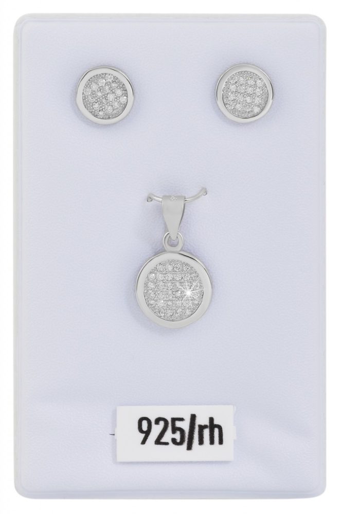 O conjunto de joias, composto por um par de brincos e o pingente correspondente, foi feito de prata esterlina 925 e adicionalmente banhado a ródio. Este revestimento de alta qualidade protege as joias contra manchas e garante um brilho brilhante e radiante. Os brincos redondos são totalmente incrustados com 16 pedras de zircônia cada. Têm diâmetro de 9 mm e espessura de 1 mm. Os brincos podem ser presos ao orifício da…