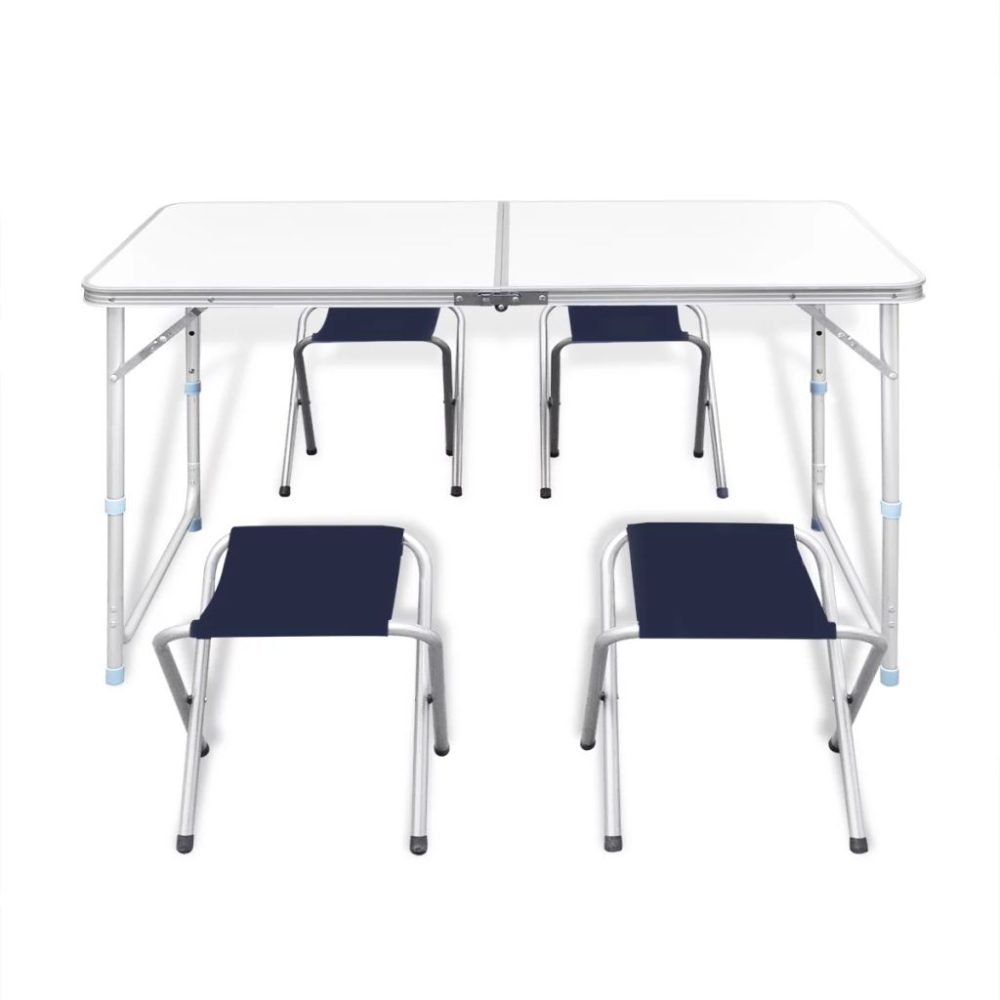 Este conjunto dobrável de mesa de campismo, consiste numa mesa dobrável e 4 cadeiras dobráveis. Graças a pega práctica de transporte e a altura ajustável, é perfeito para uso em cozinhas, em pátios, em jardins ou em piqueniques e acampamentos.