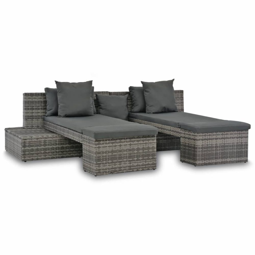 Este conjunto lounge em vime é composto por 2 sofás, 2 espreguiçadeiras, 5 almofadas e 2 almofadões de assento, oferecendo um ambiente magnífico para poder desfrutar de momentos privilegiados com amigos e familiares num ambiente de relaxamento. O conjunto lounge pode ser montado de diferentes formas uma vez que as espreguiçadeiras são móveis.
