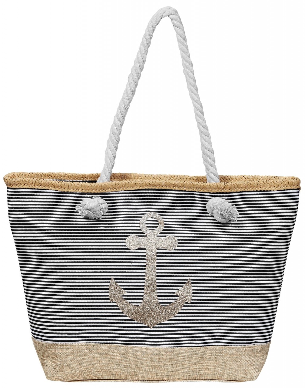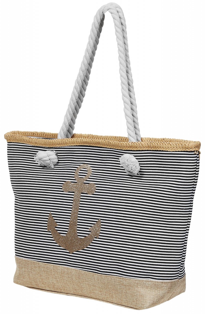 Esta bolsa de praia náutica com alças de cordão é feita de tecido e apresenta um grande motivo de âncora.